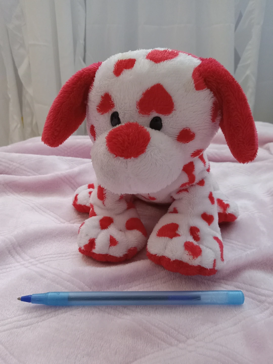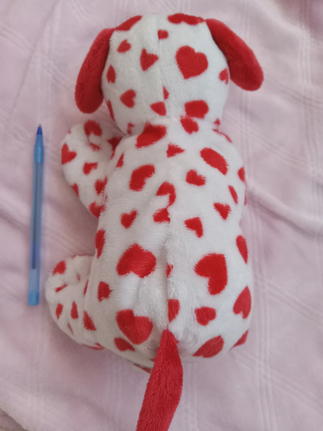 This is a Ty Beanie Baby plush toy dog with a red heart pattern. It's made with 100% TyLux material. This cuddly toy is perfect for collectors or as a sweet gift!