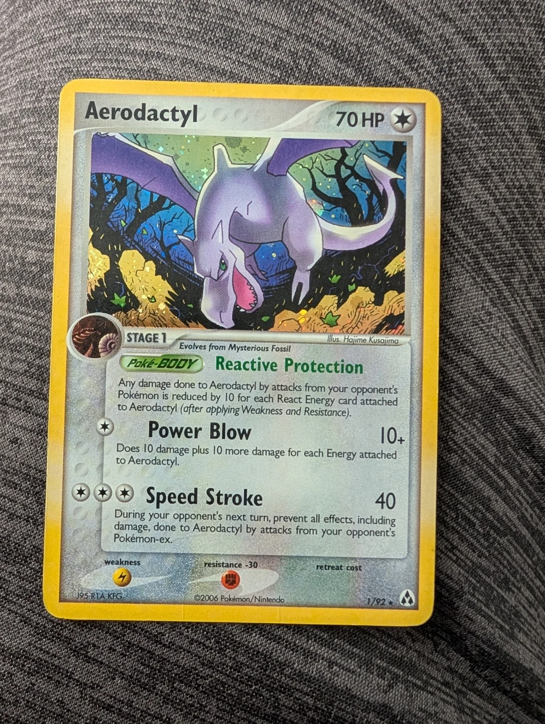 This is a 2006 Pokemon Aerodactyl trading card. It's stage 1 and has the Poke-BODY Reactive Protection. Its Power Blow attack does 10+ damage. It also has Speed Stroke for 40 damage.