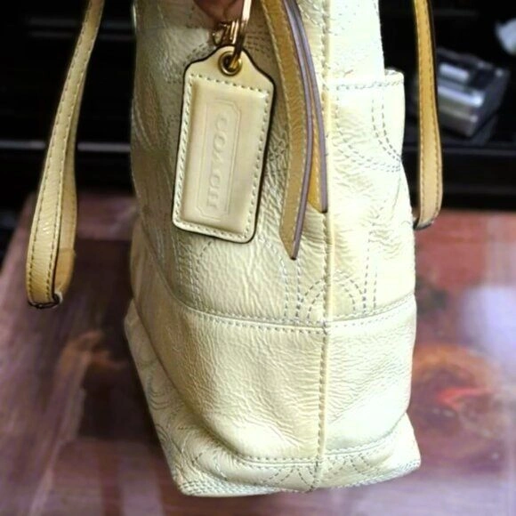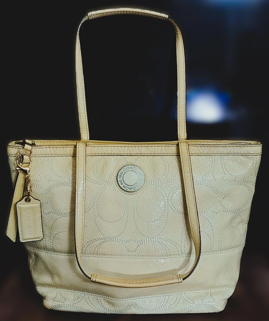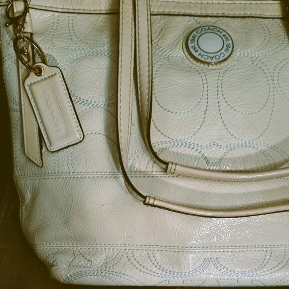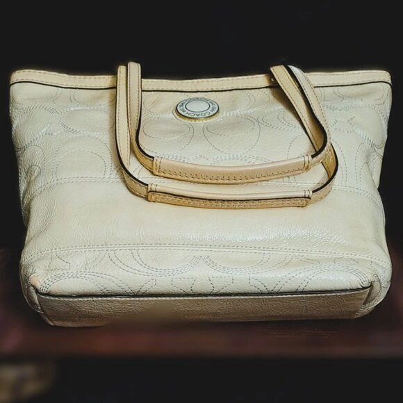 Authentic Coach Signature Stitch Genuine Leather Tote Handbag (F19198). Authentic Coach Signature Stitch Genuine Leather Tote Handbag (F19198). This beautiful and authentic Coach tote features the brand's iconic signature "C" pattern subtly embossed in glossy patent leather. The perfect everyday bag, combining classic style with durable material. Original price $328