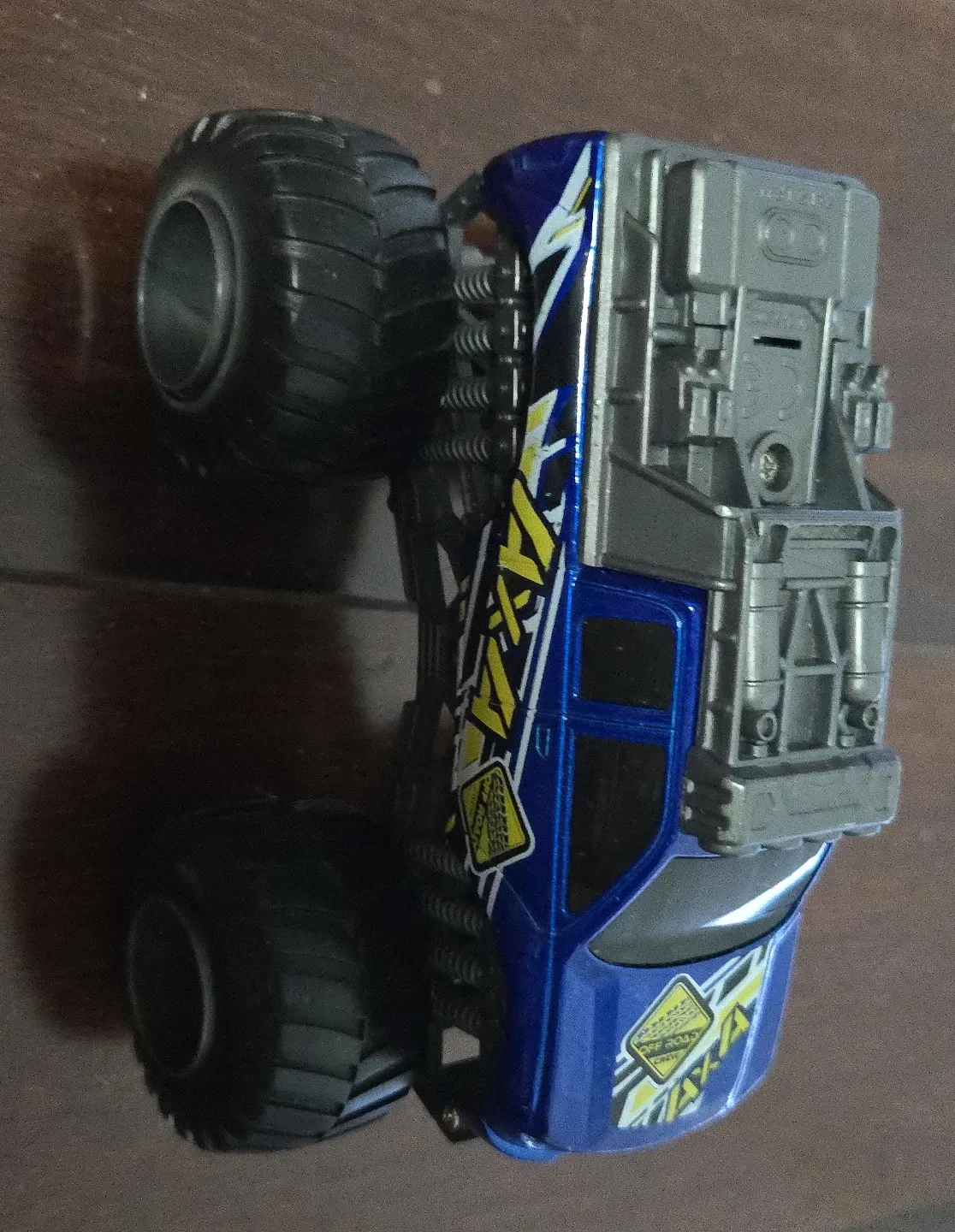 A blue monster truck toy with large off-road tires. It features detailed suspension and body graphics. This toy is built for rough play!