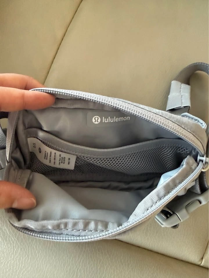 Clean Lululemon belt bag in light grey. Features a main zippered compartment with an inside mesh pocket and an adjustable strap. Super handy for essentials.