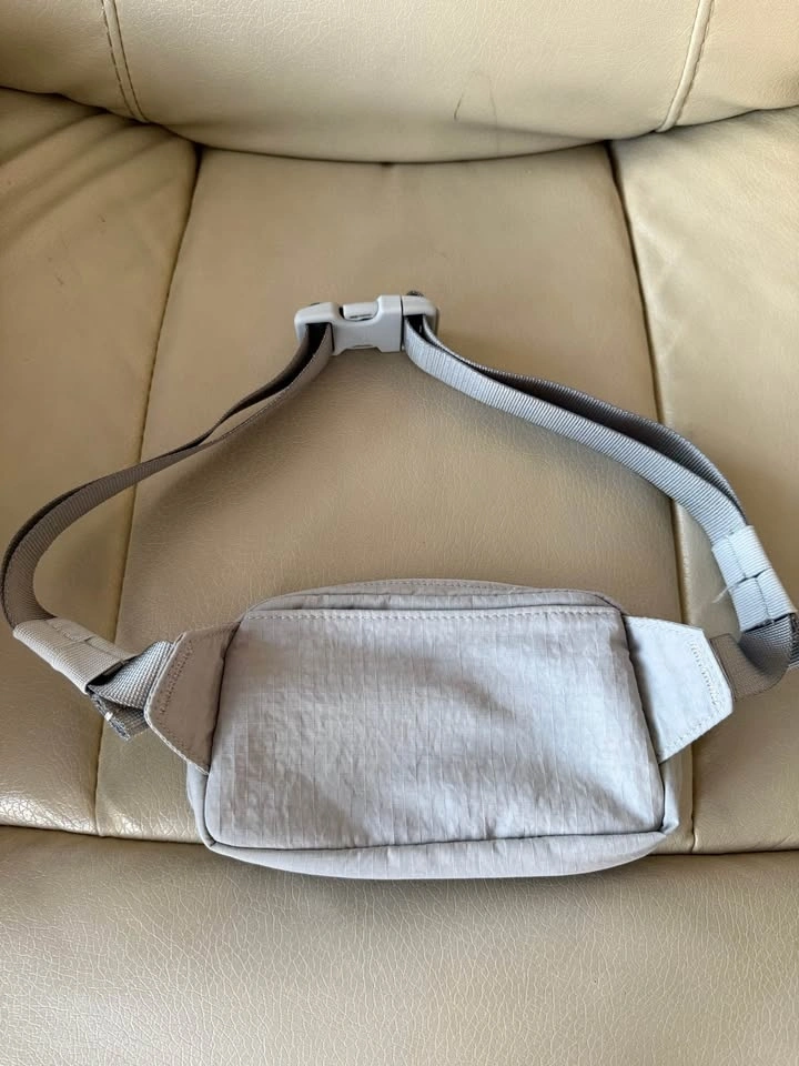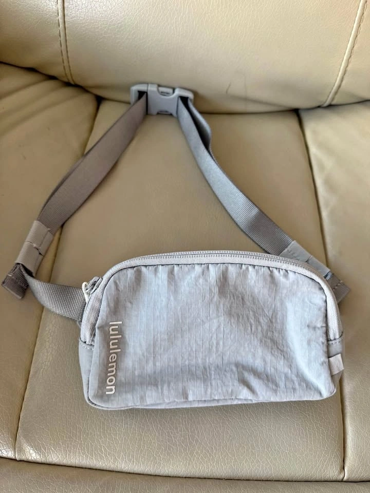 Clean Lululemon belt bag in light grey. Features a main zippered compartment with an inside mesh pocket and an adjustable strap. Super handy for essentials.