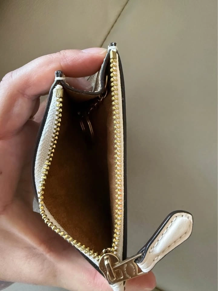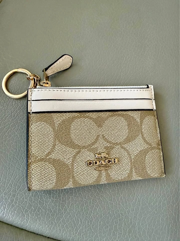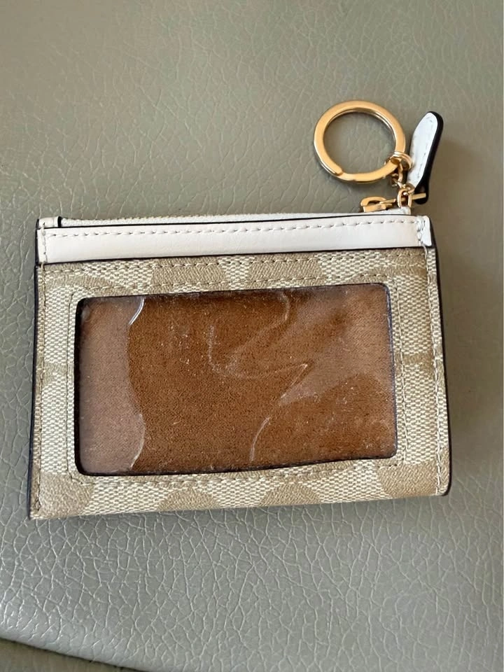 Cute Coach card holder with signature monogram print. Features a clear ID window, card slots, and a zippered pouch for coins. Also has a keychain. Super handy for just essentials.