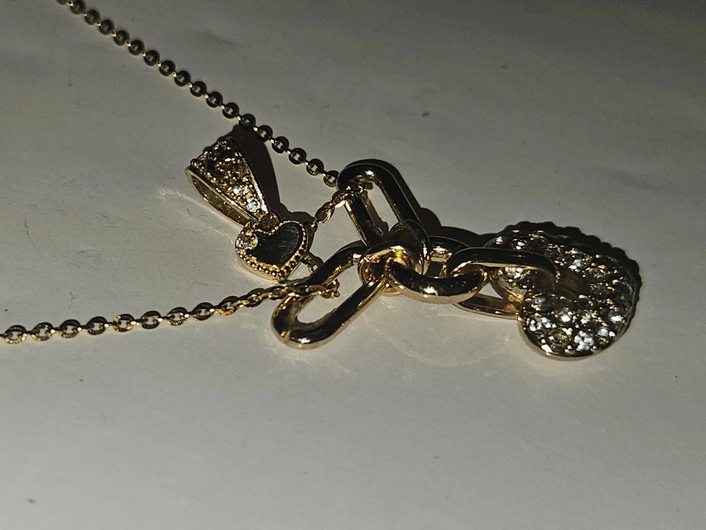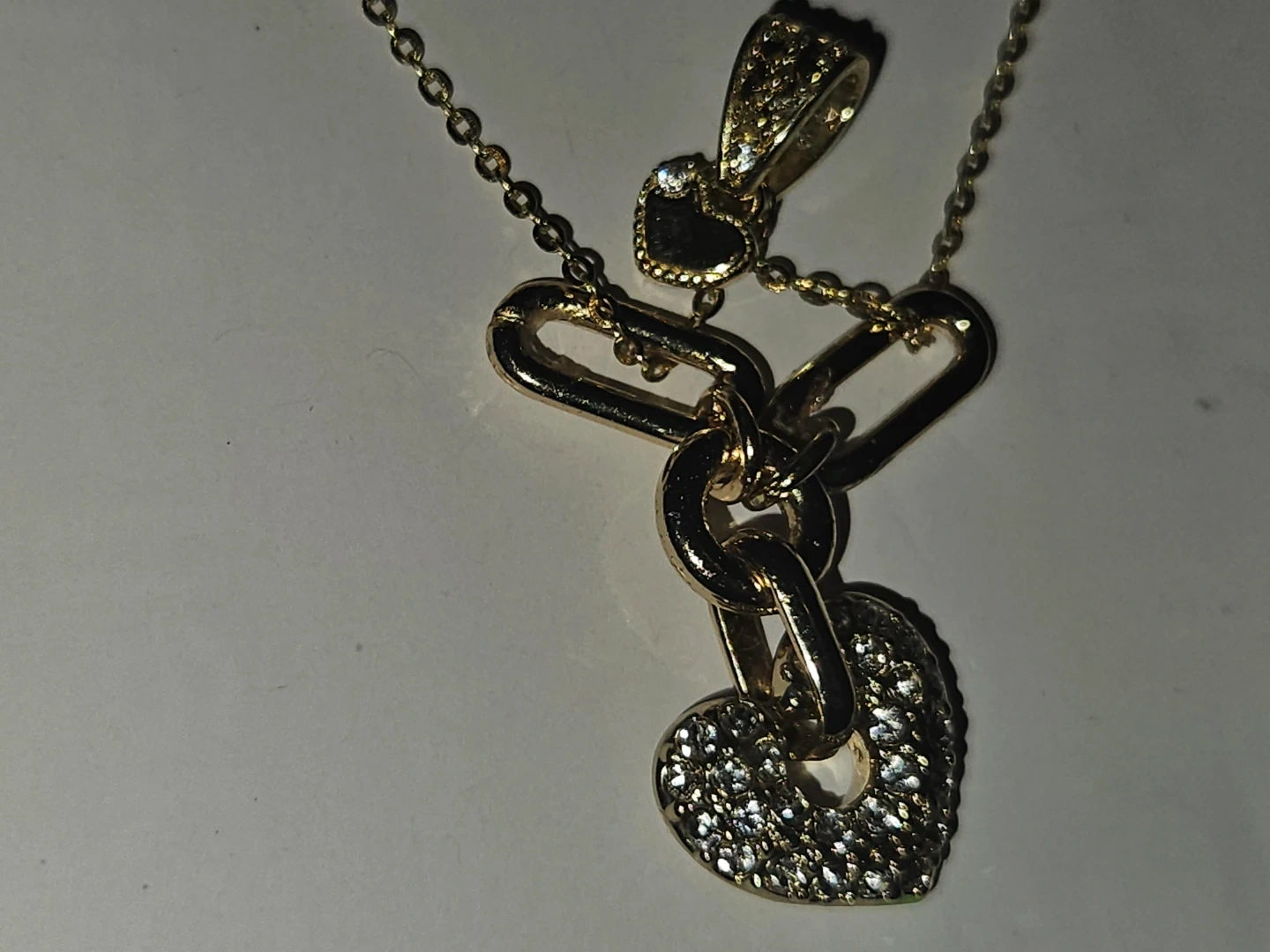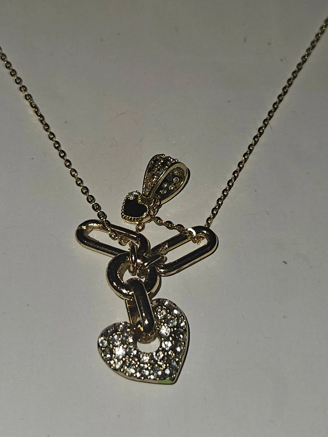 This delicate 24k gold plated chain necklace features a unique chain with a heart-shaped solid yellow 24k pendant and diamond cluster includes an adjustable clasp for a comfortable fit. A small heart-shaped dangle is also present on the chain. Brand new.