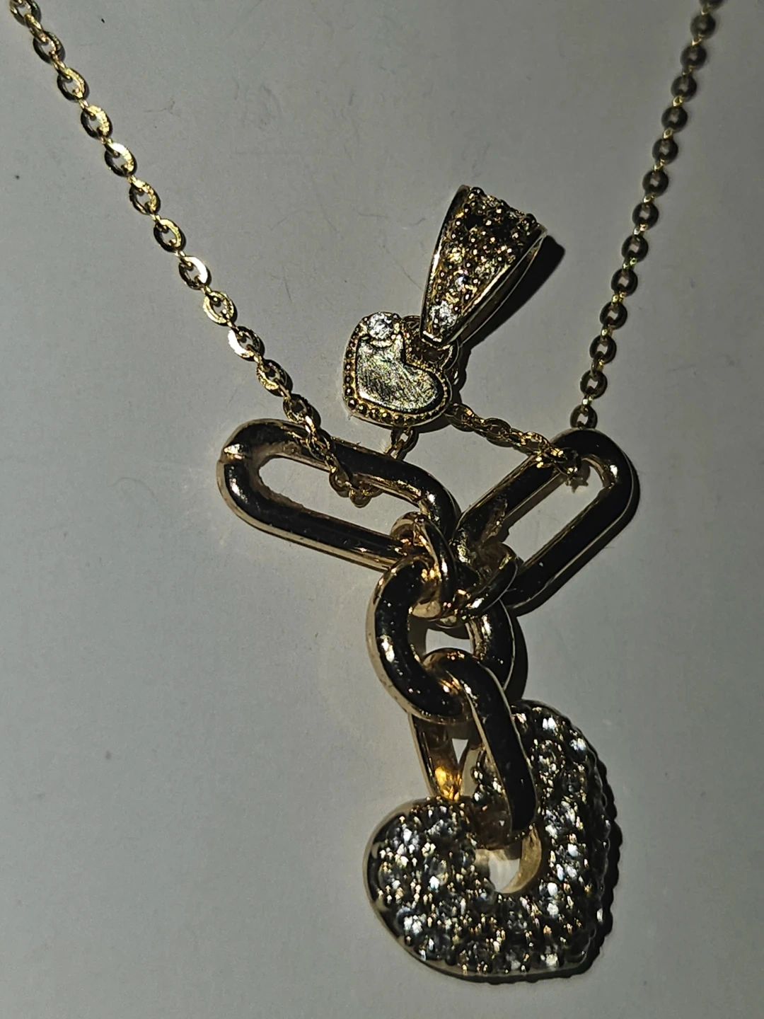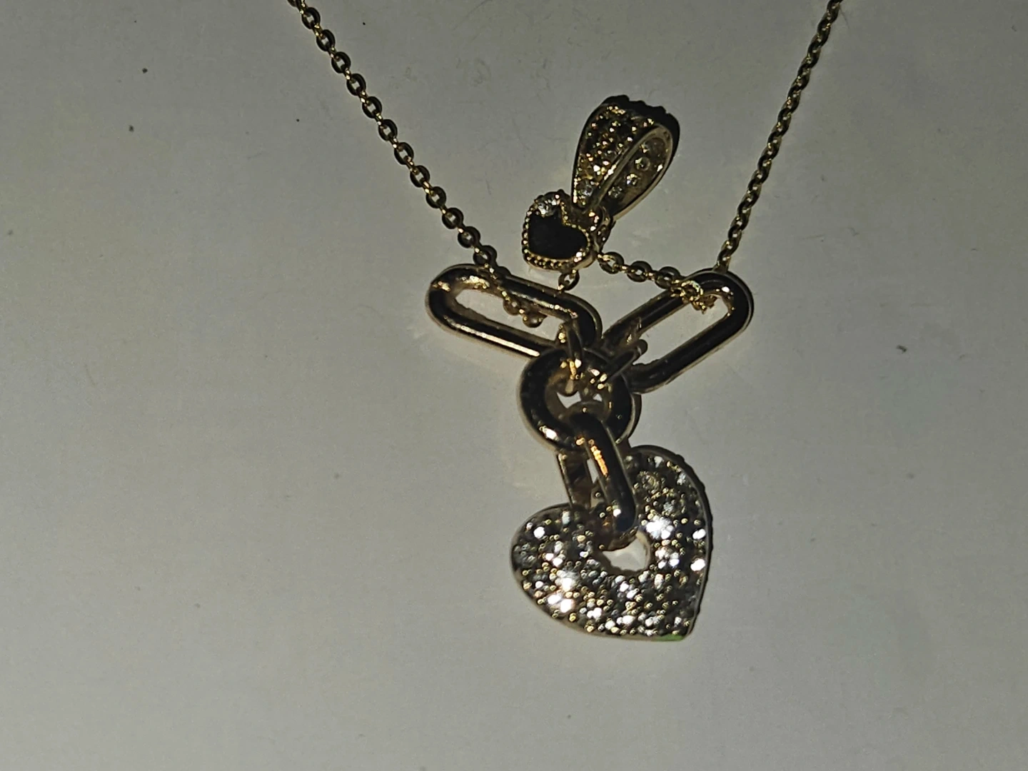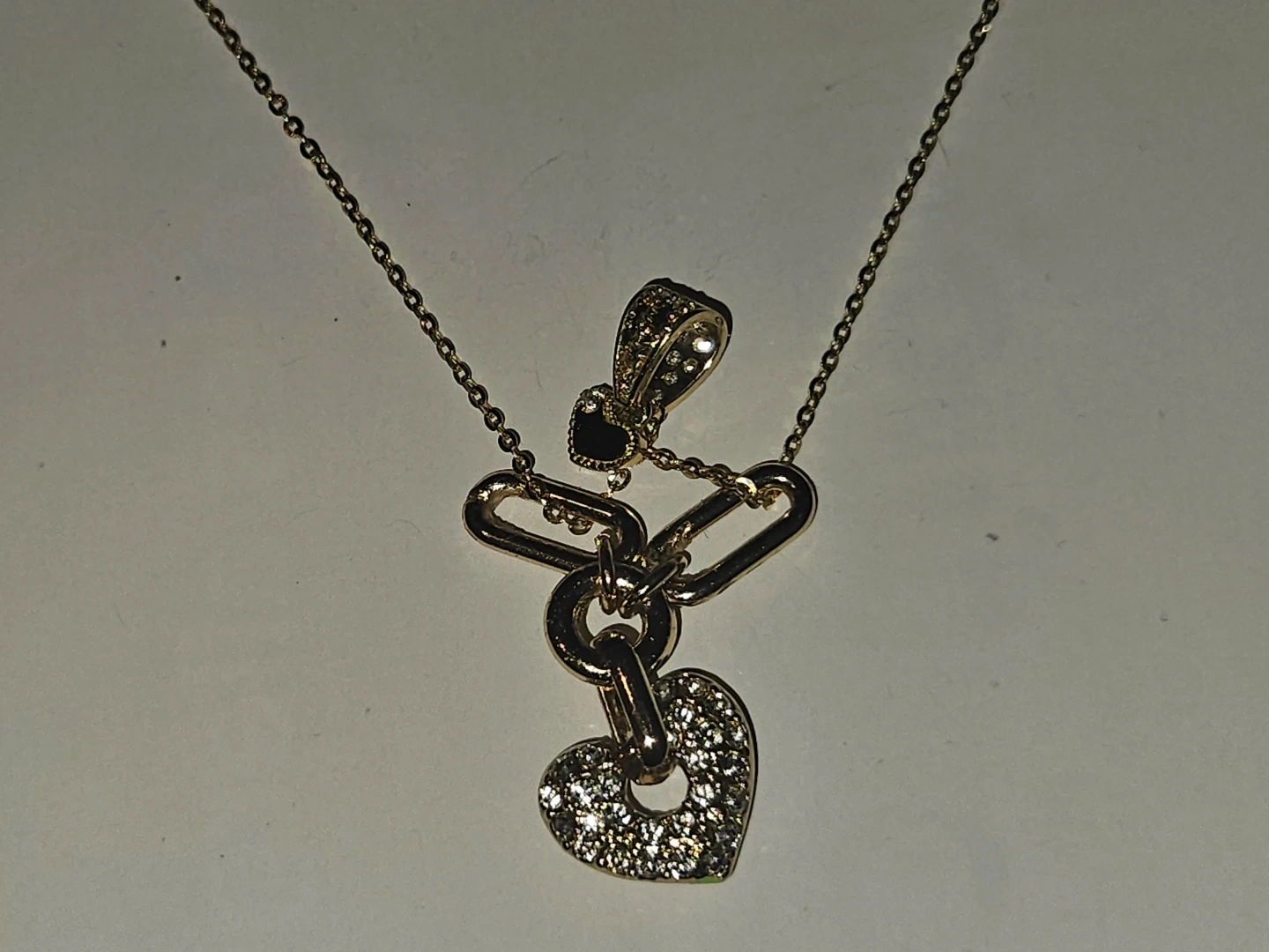 This delicate 24k gold plated chain necklace features a unique chain with a heart-shaped solid yellow 24k pendant and diamond cluster includes an adjustable clasp for a comfortable fit. A small heart-shaped dangle is also present on the chain. Brand new.