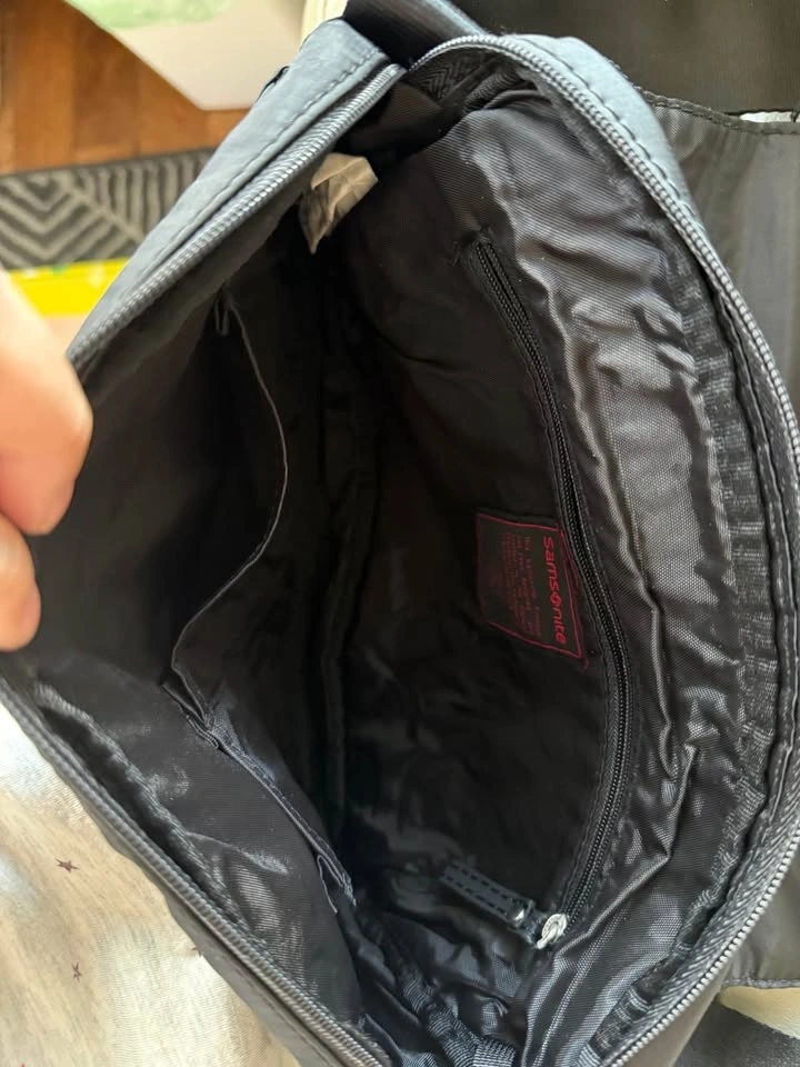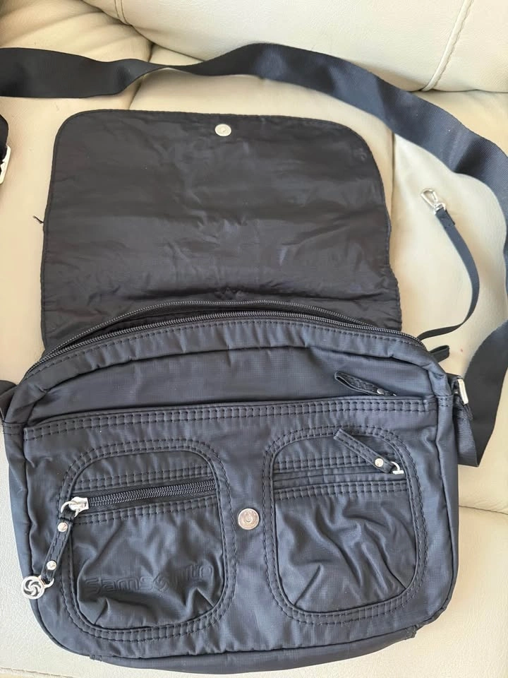 Sleek black Samsonite messenger bag. Has an adjustable strap so you can wear it crossbody or over shoulder. Lots of pockets for organizing stuff, including zippered ones on the front and inside. Great for travel or just everyday use. Pickup in Newmarket.