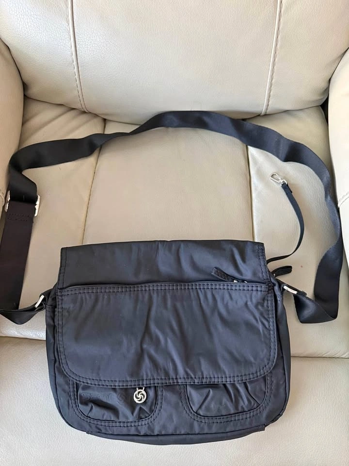 Sleek black Samsonite messenger bag. Has an adjustable strap so you can wear it crossbody or over shoulder. Lots of pockets for organizing stuff, including zippered ones on the front and inside. Great for travel or just everyday use. Pickup in Newmarket.