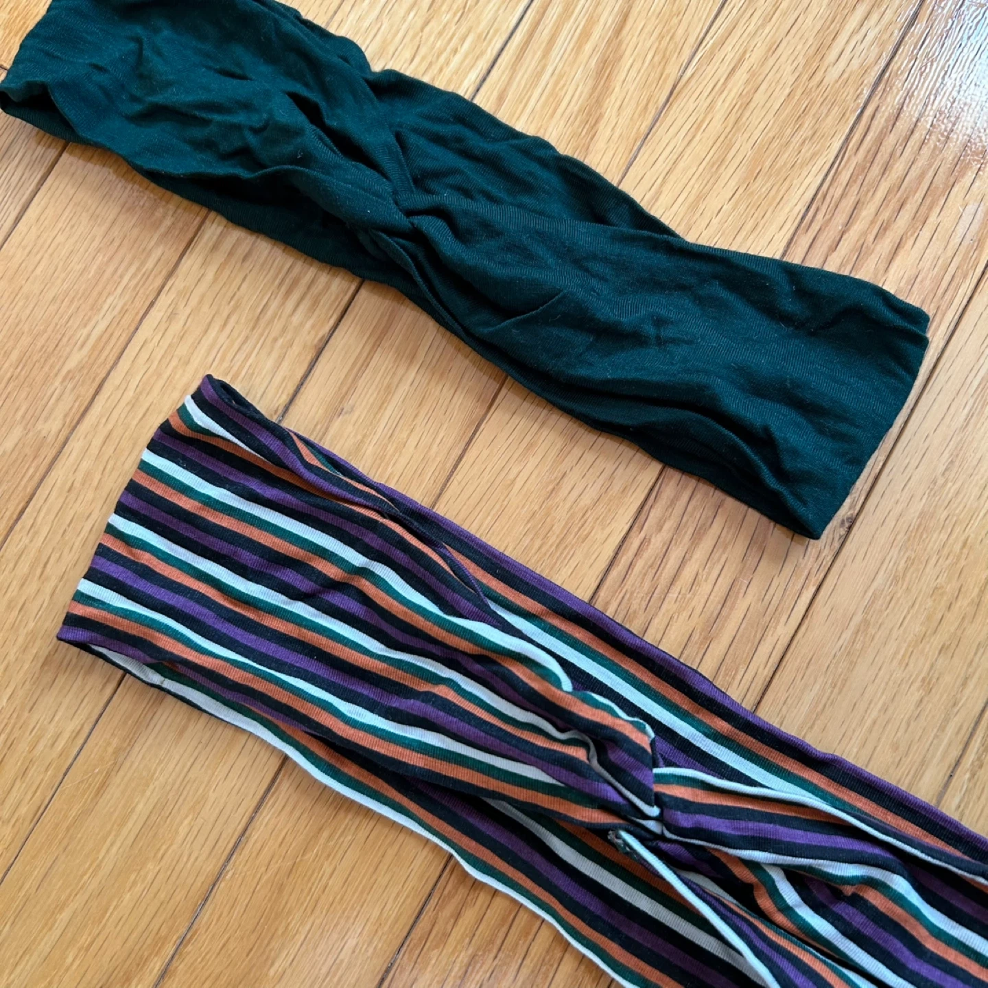 Set of two headbands. One is a solid dark green colour. The other features a stripe pattern in purple, orange, white, and black. Both have a twisted knot detail at the front.