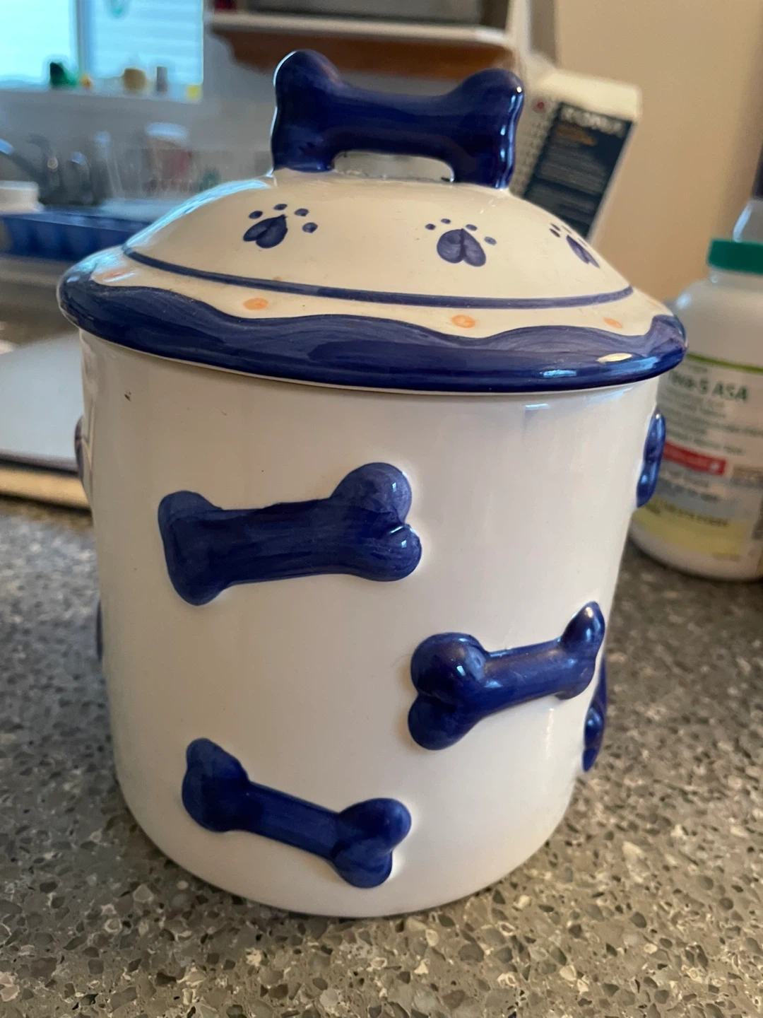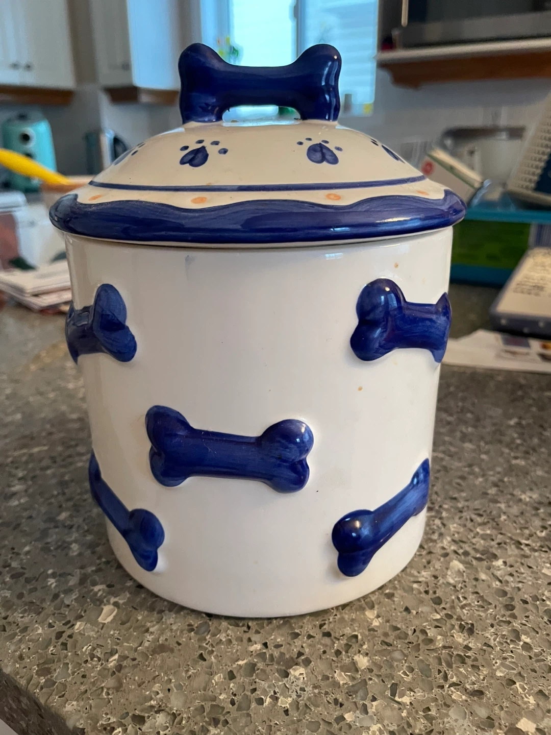 White ceramic canister decorated with blue bone accents and paw prints. It has a lid with a bone-shaped handle. This jar is perfect for storing dog treats or biscuits!