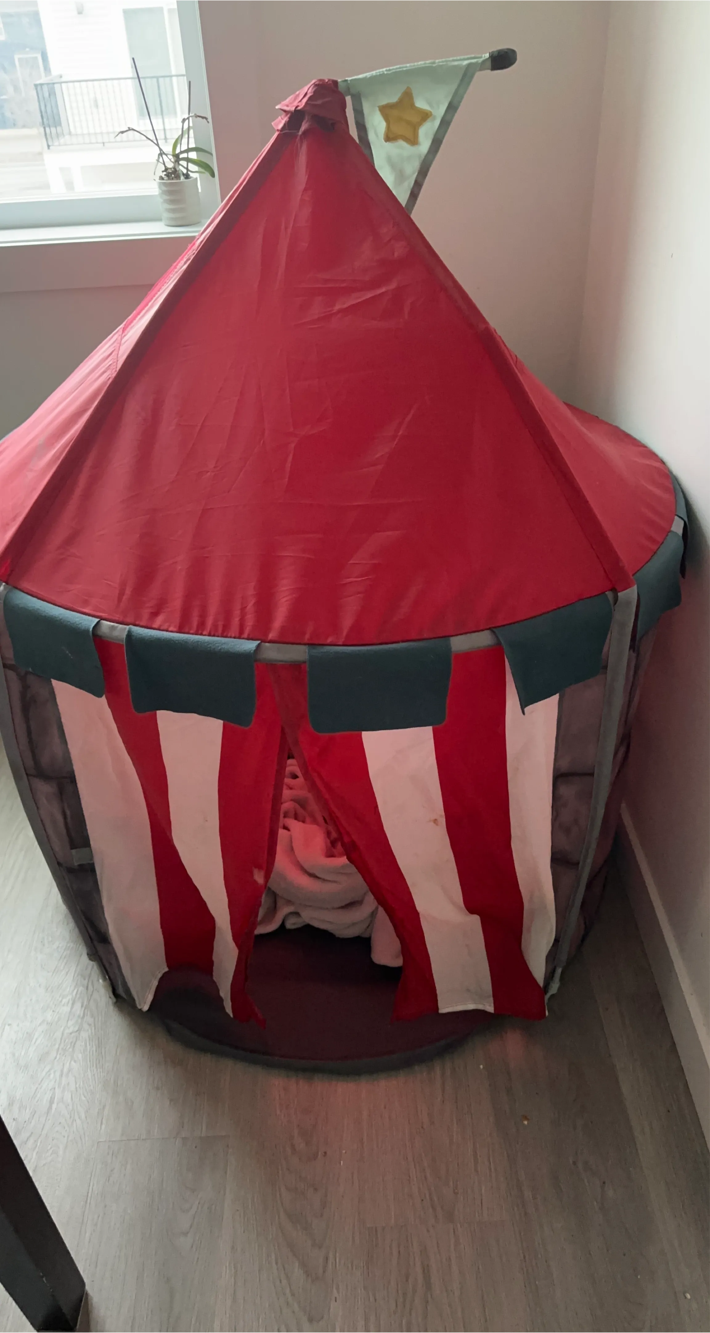 This is a fun kids' play tent designed to look like a circus tent. It's red with white and red striped curtains. The base is round and grey. It's a great spot for kids to play and imagine!