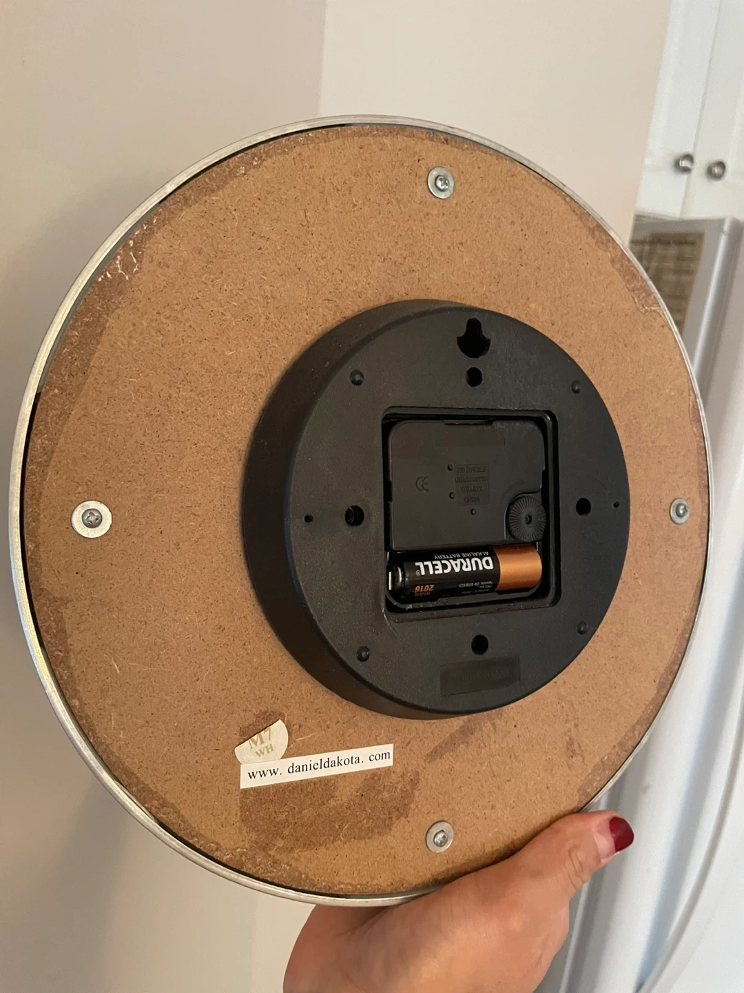 This Daniel Dakota wall clock features a sleek metal frame and a white face with clear hour markers. It runs on a quartz movement for accurate timekeeping. The back indicates the brand and includes a website for more info. It's battery operated.