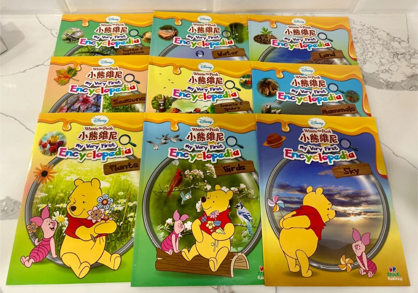 A set of Winnie the Pooh My Very First Encyclopedia books. This collection covers topics like animals, seasons, plants, and the sky. It's great for young learners interested in nature and the world around them!