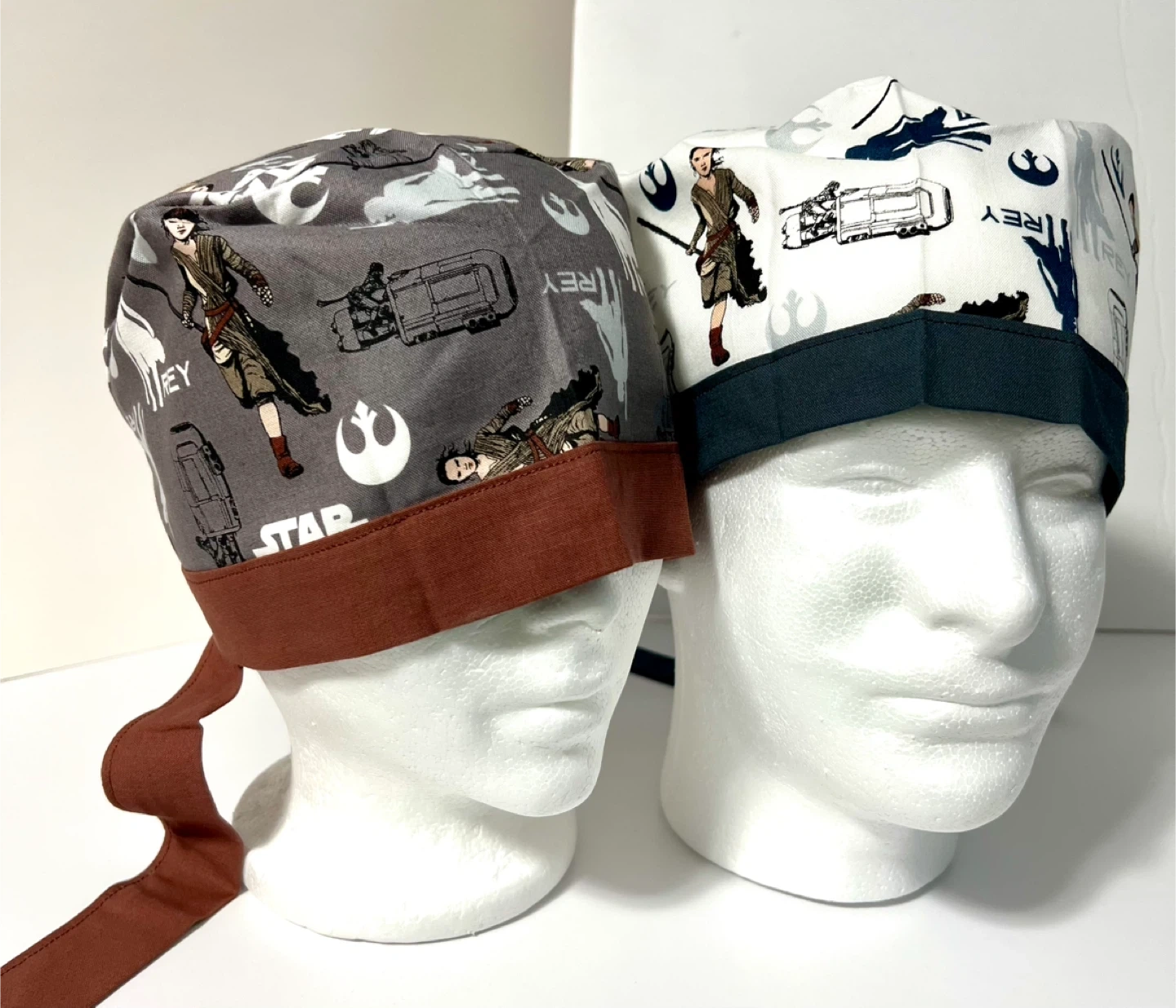 Two scrub caps featuring Rey from Star Wars. One cap is grey with various Star Wars symbols and Rey. The other cap is white with a repeating pattern of Rey and Star Wars imagery. Both caps have tie-backs.