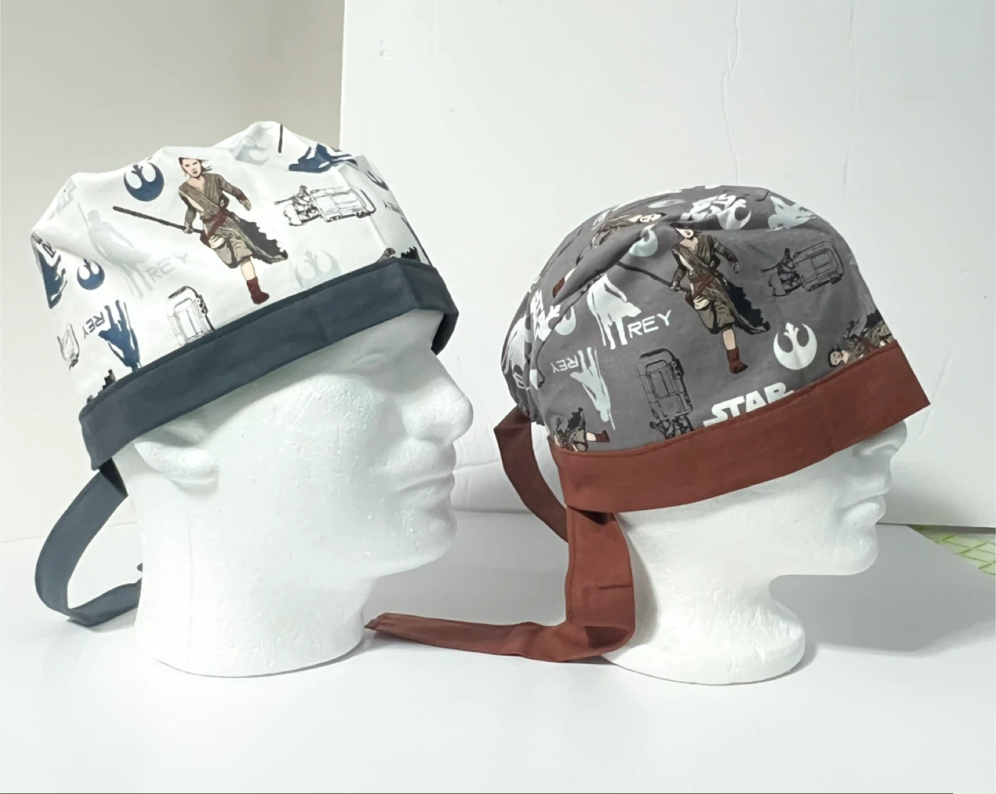 Two scrub caps featuring Rey from Star Wars. One cap is grey with various Star Wars symbols and Rey. The other cap is white with a repeating pattern of Rey and Star Wars imagery. Both caps have tie-backs.