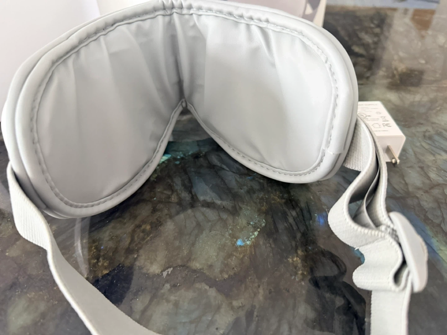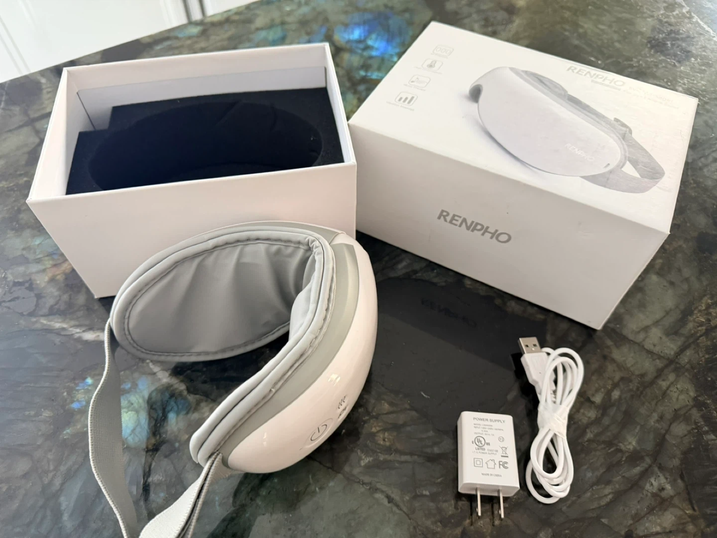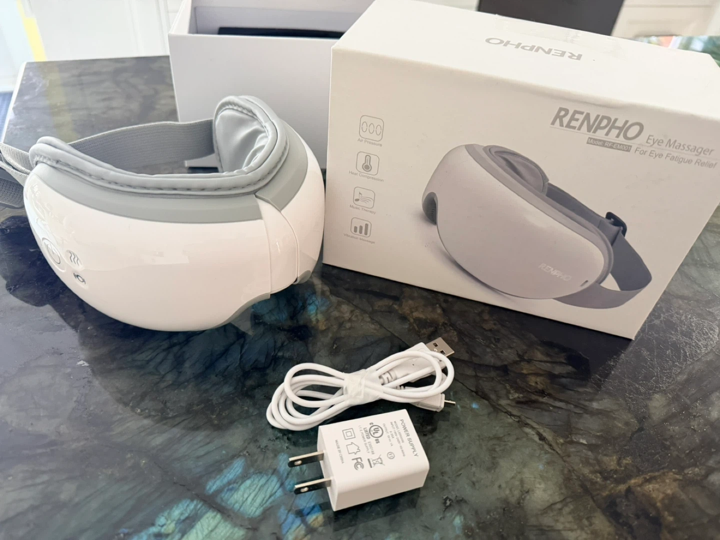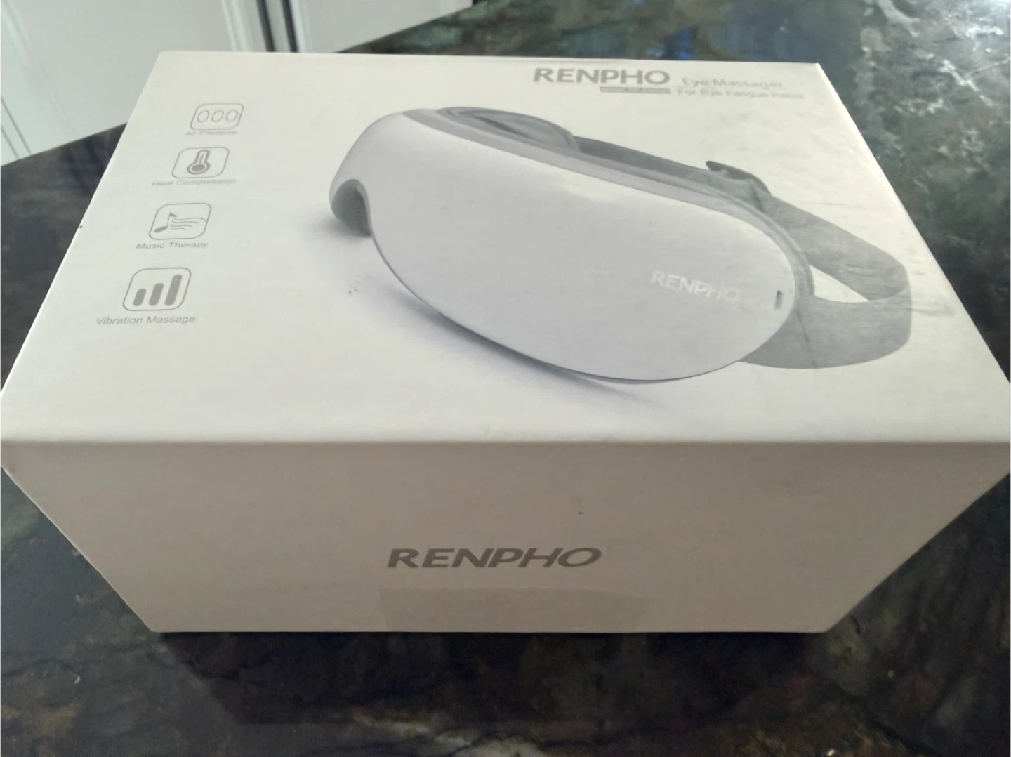 RENPHO eye massager with air pressure, heat compression, music therapy, and vibration massage. Includes charger and original box. Helps relieve eye fatigue.