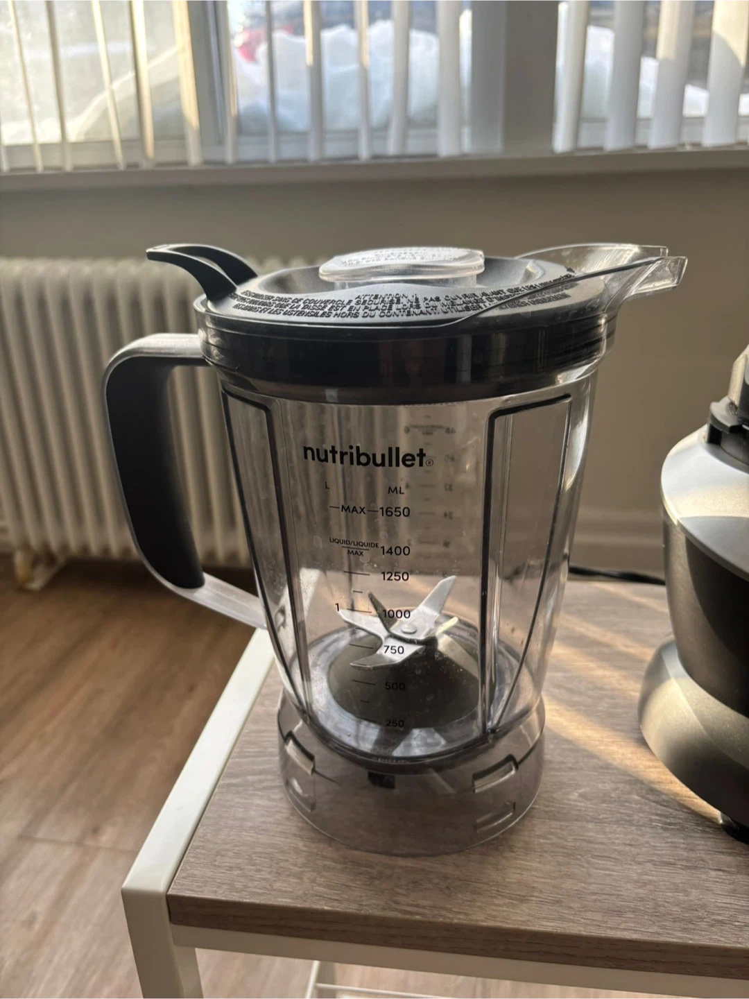 This is a NutriBullet blender. It comes with a compact base, a large pitcher, and a to-go cup with a blade. The pitcher has markings for liquid and dry ingredients, going up to 1650ml.