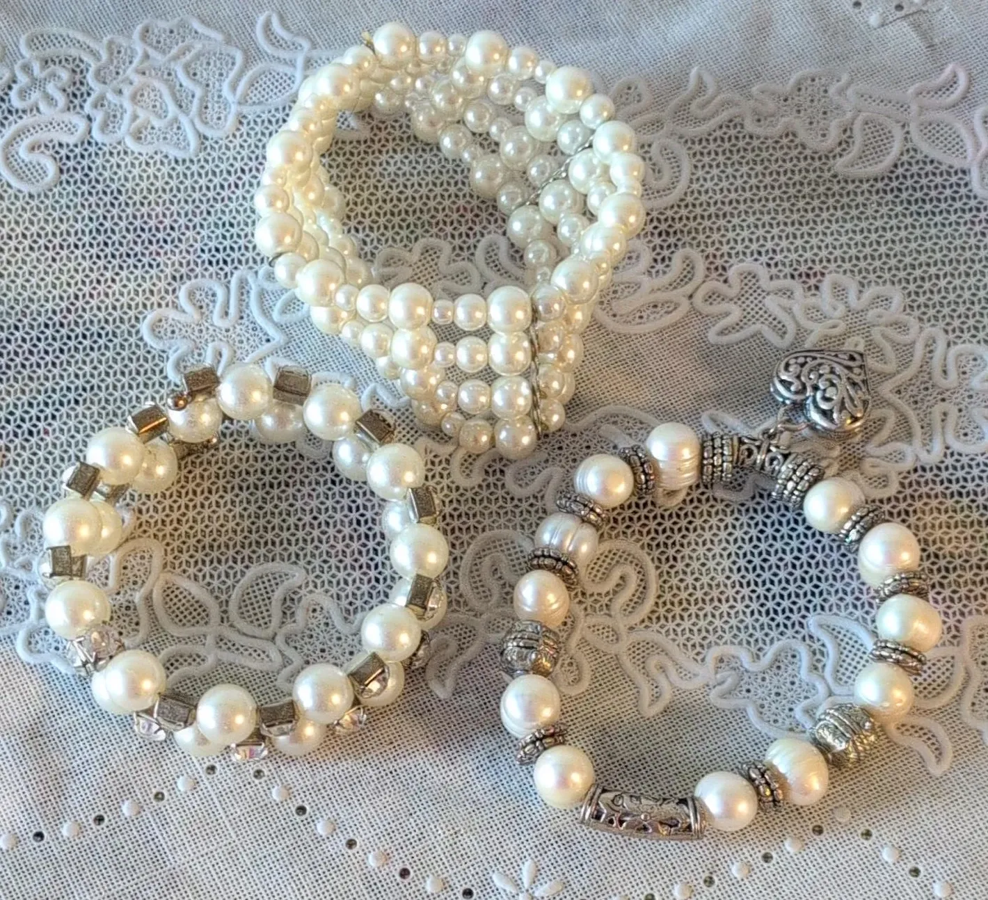 Three elegant bracelets with faux pearls and silver-tone accents. Includes a multi-strand pearl bracelet and two single-strand designs. These add a touch of class to any outfit!