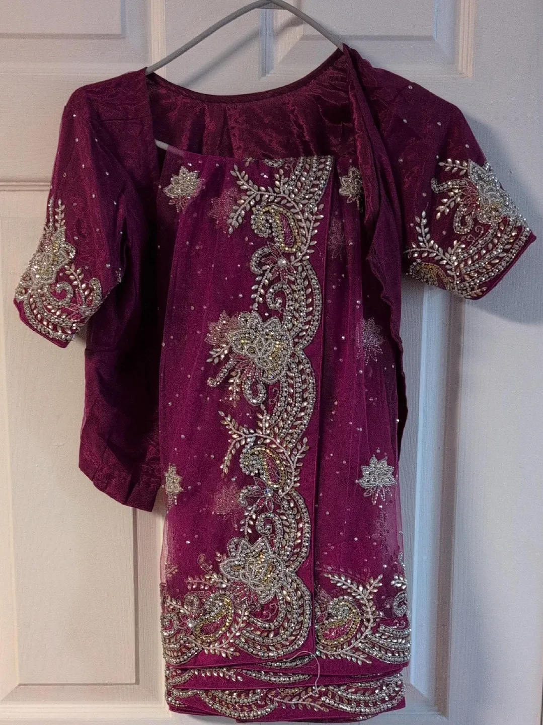 Beautiful deep purple embroidered Saree with blouse. It's adorned with intricate silver and gold thread work, sequins, and bead embellishments