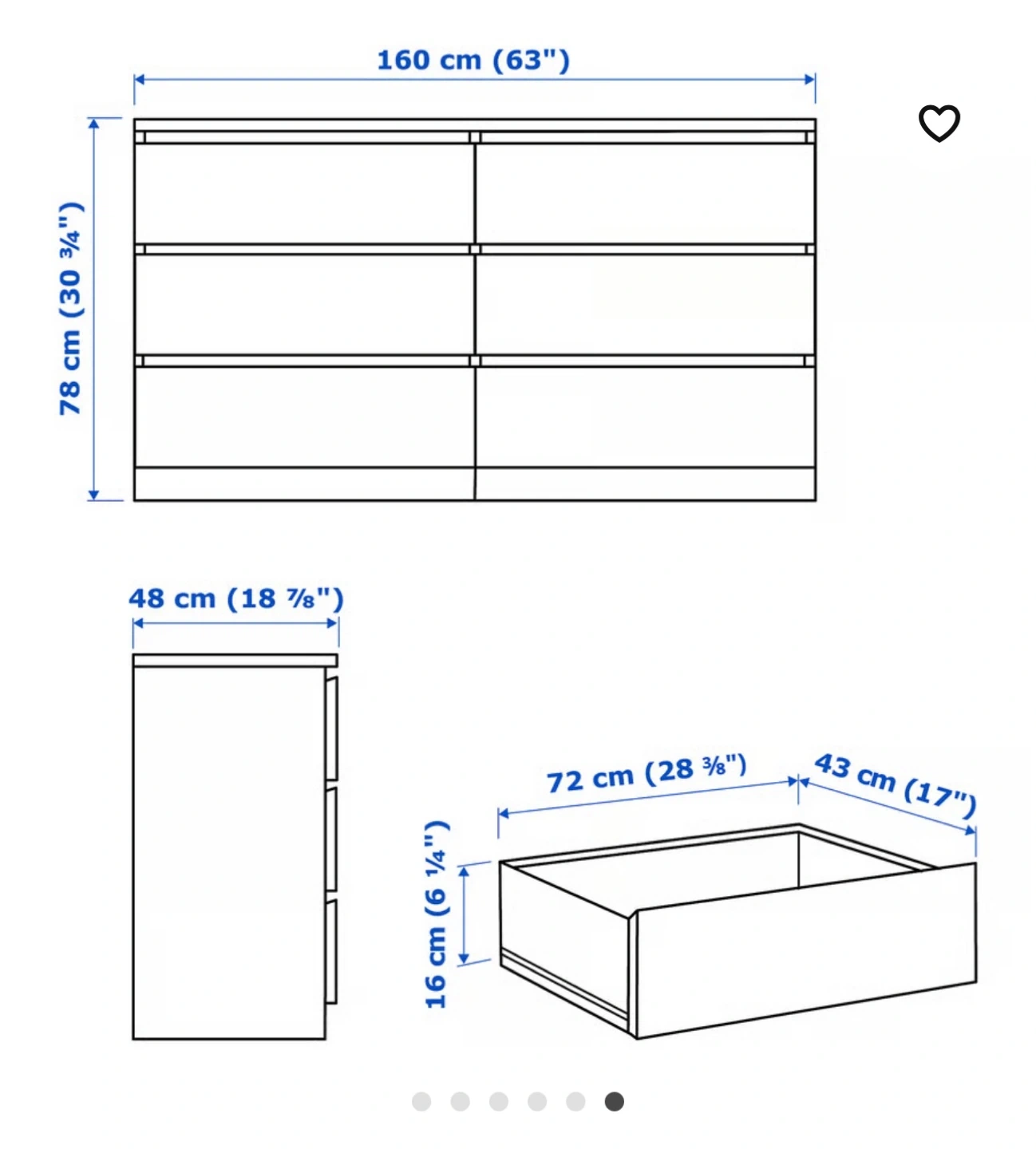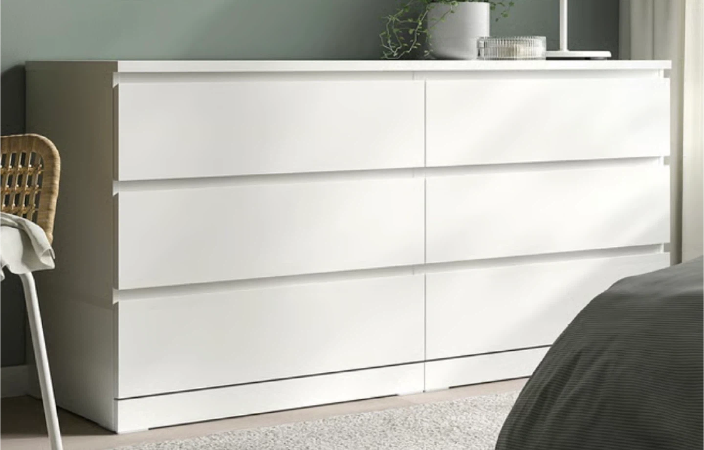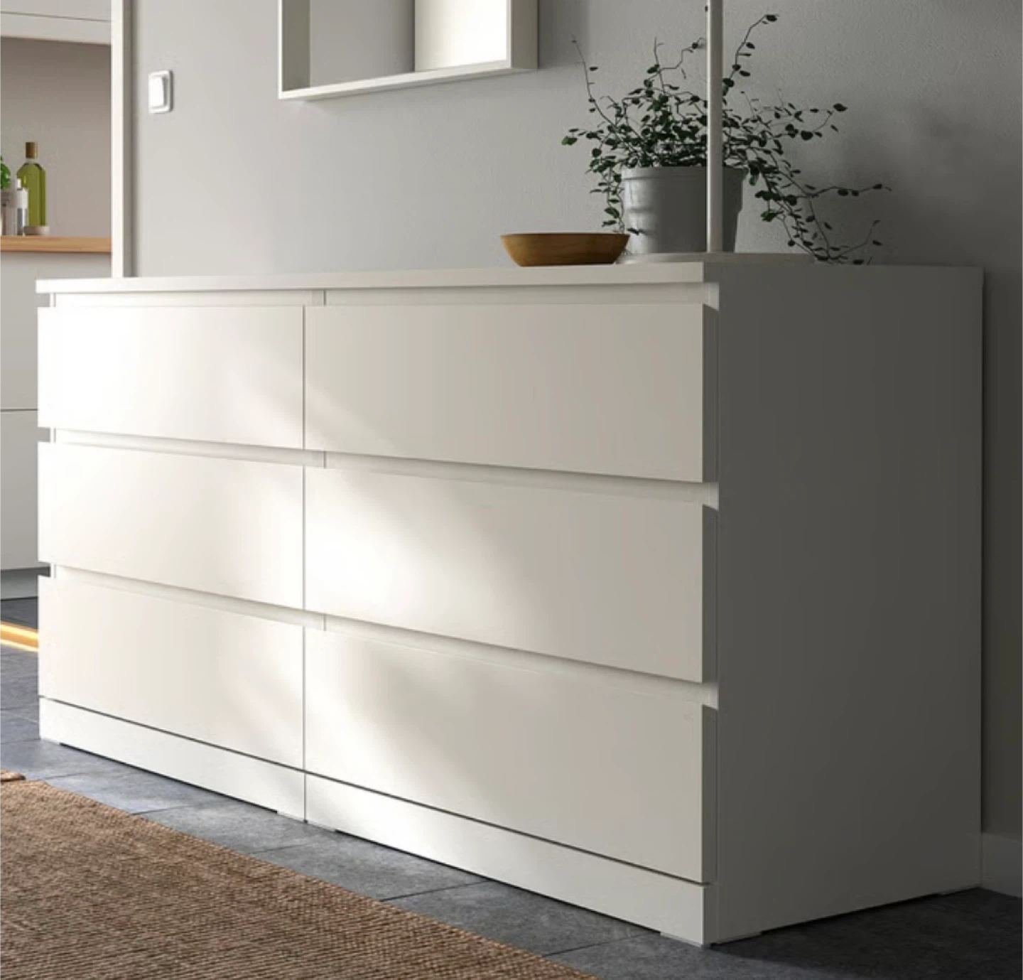 White 6-drawer dresser. Offers ample storage space for clothes or linens. Clean, modern design. Bought 10 months ago but too big for my room