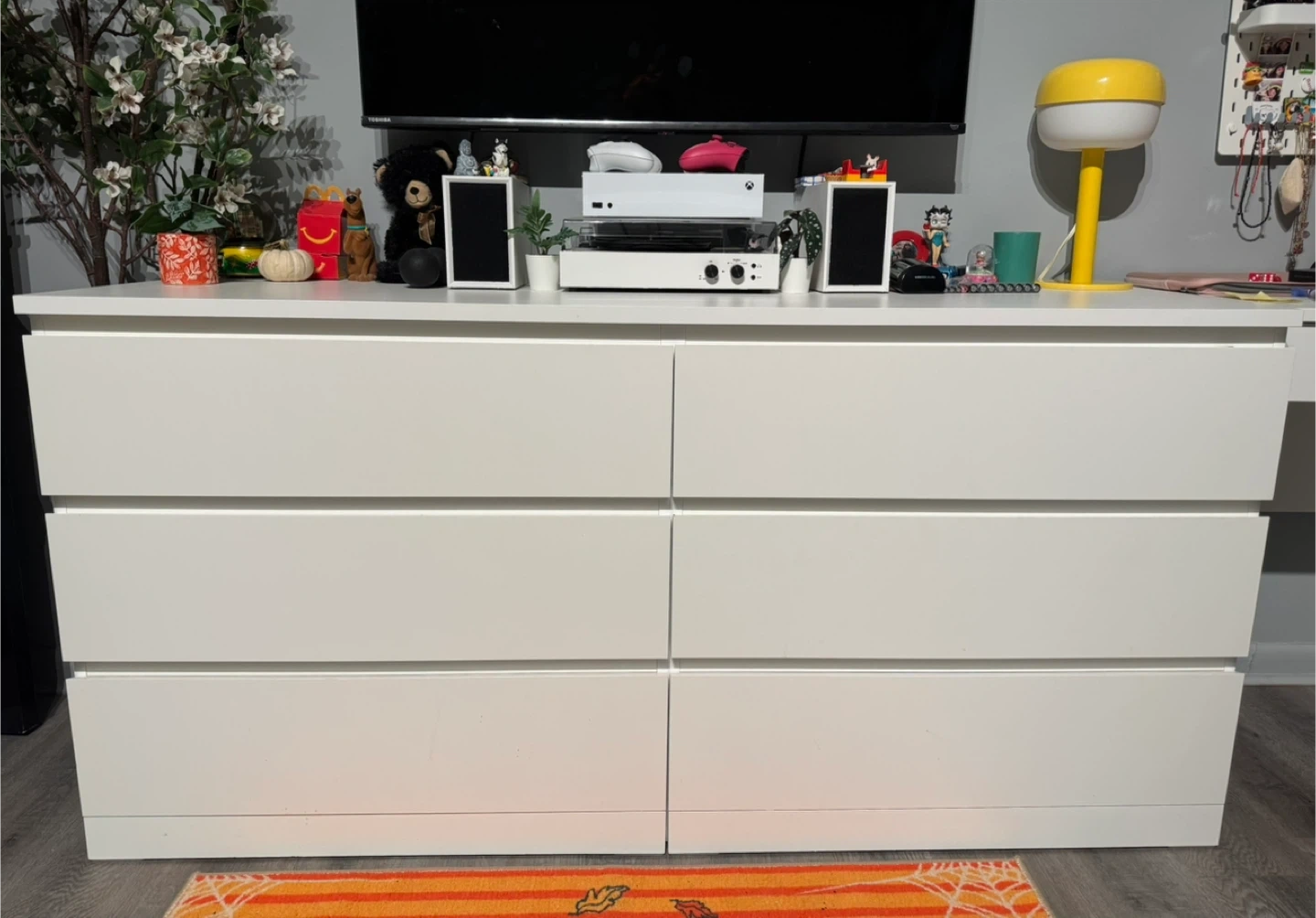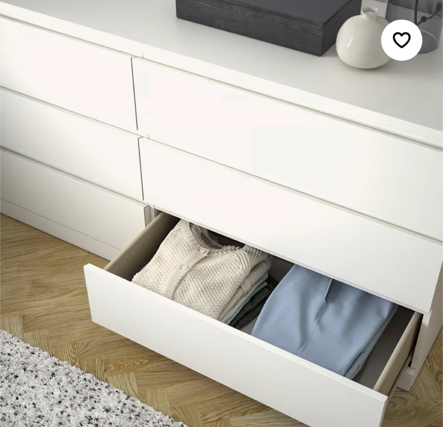 White 6-drawer dresser. Offers ample storage space for clothes or linens. Clean, modern design. Bought 10 months ago but too big for my room