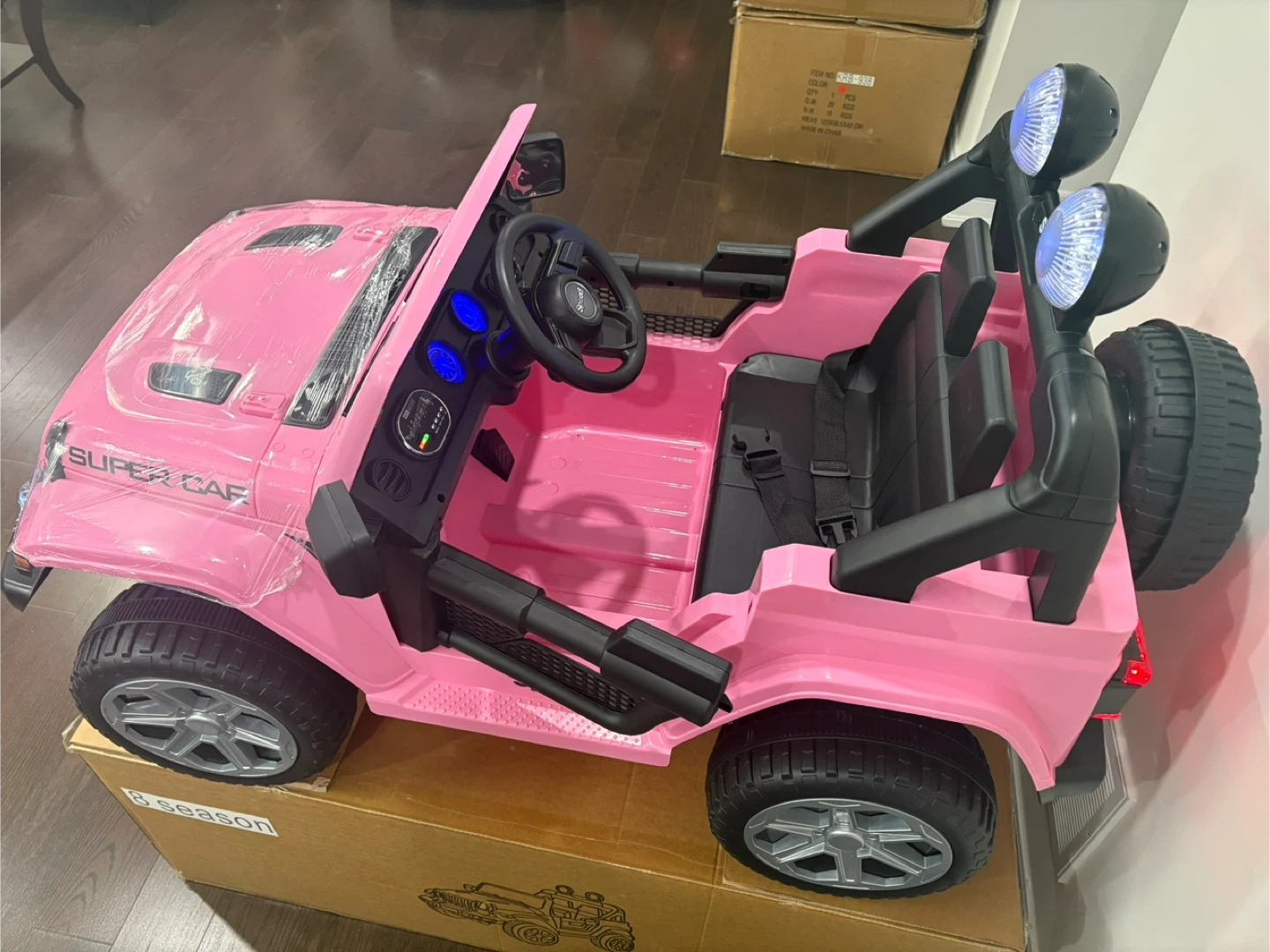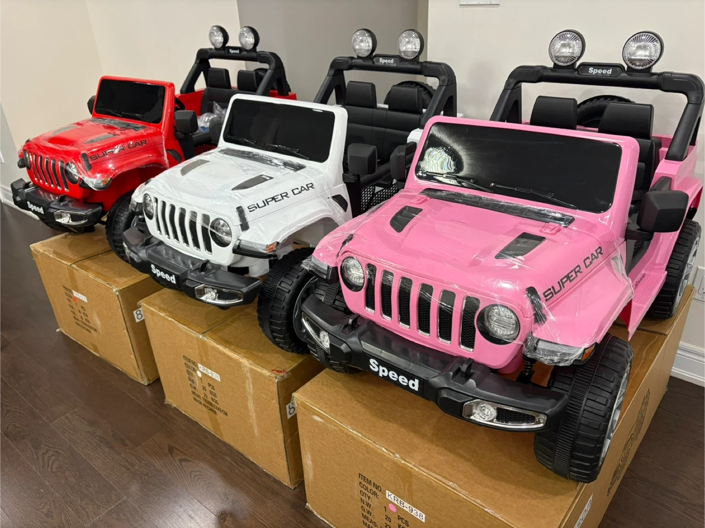 This electric ride-on car is a fantastic toy for kids. It has a super car design and is available in red, white, or pink. Lights and sounds add to the fun driving experience. Suitable for young adventurers! , 12 v battery , build in speaker and usb port to play your own music , suspensions , key to start