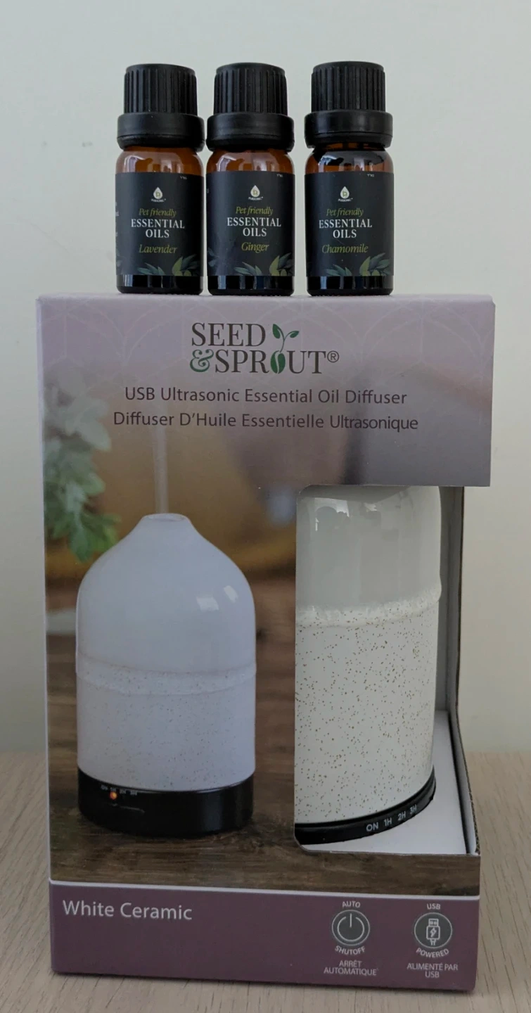 This white ceramic ultrasonic essential oil diffuser by Seed & Sprout comes with three pet-friendly essential oil bottles: Lavender, Ginger, and Chamomile. It's USB powered and offers automatic shutoff with 1, 2, and 3-hour timer settings. It's great for creating a calming atmosphere in any room.