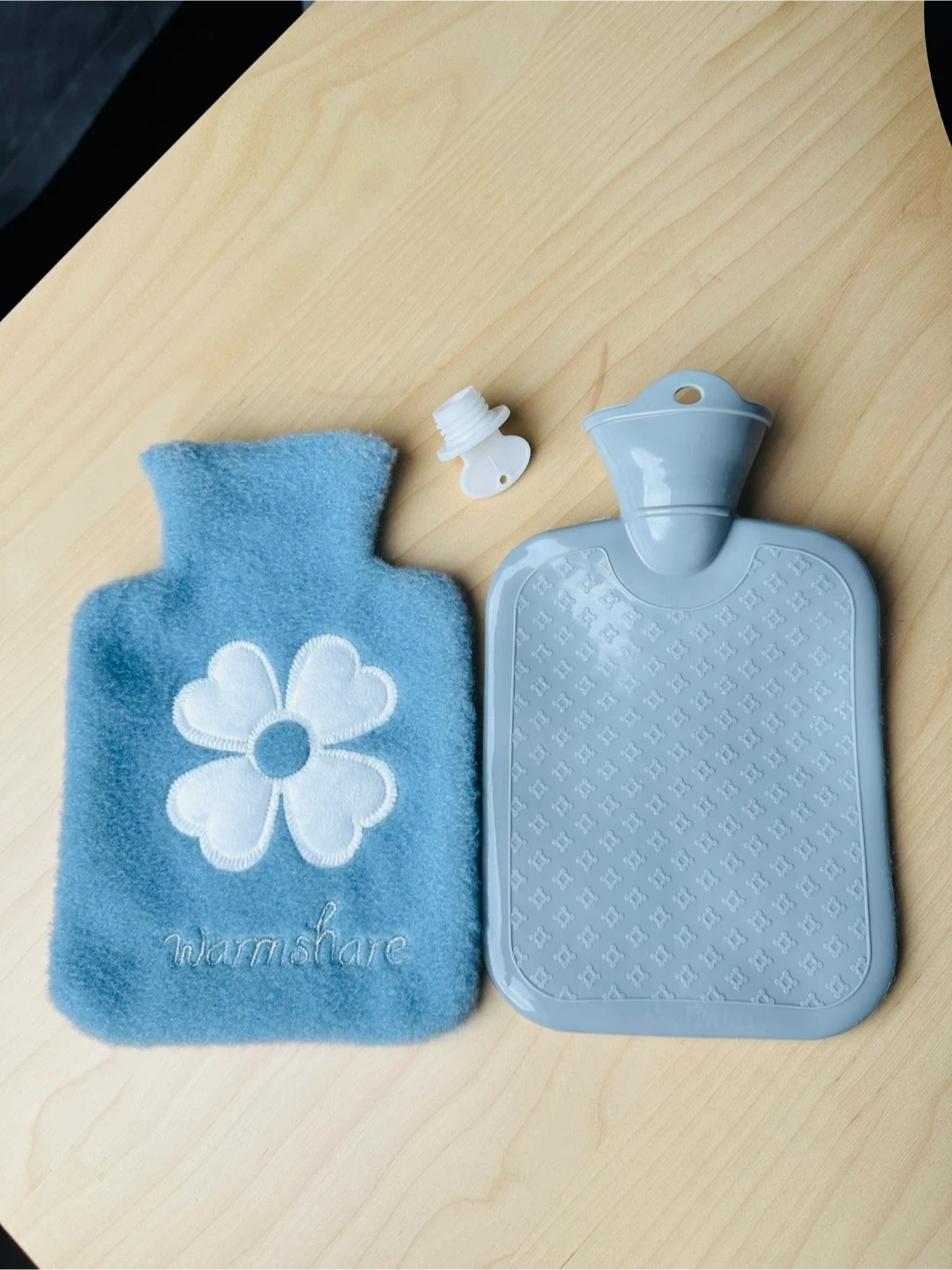 This is a blue fleece hot water bottle with a white flower design. It comes with a separate stopper. It's made of fleece and rubber.