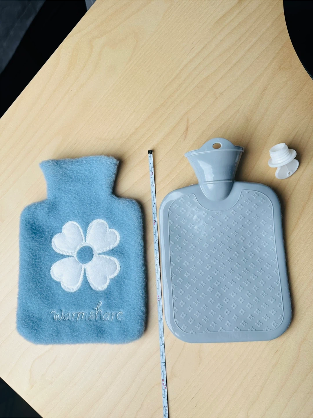 This is a blue fleece hot water bottle with a white flower design. It comes with a separate stopper. It's made of fleece and rubber.