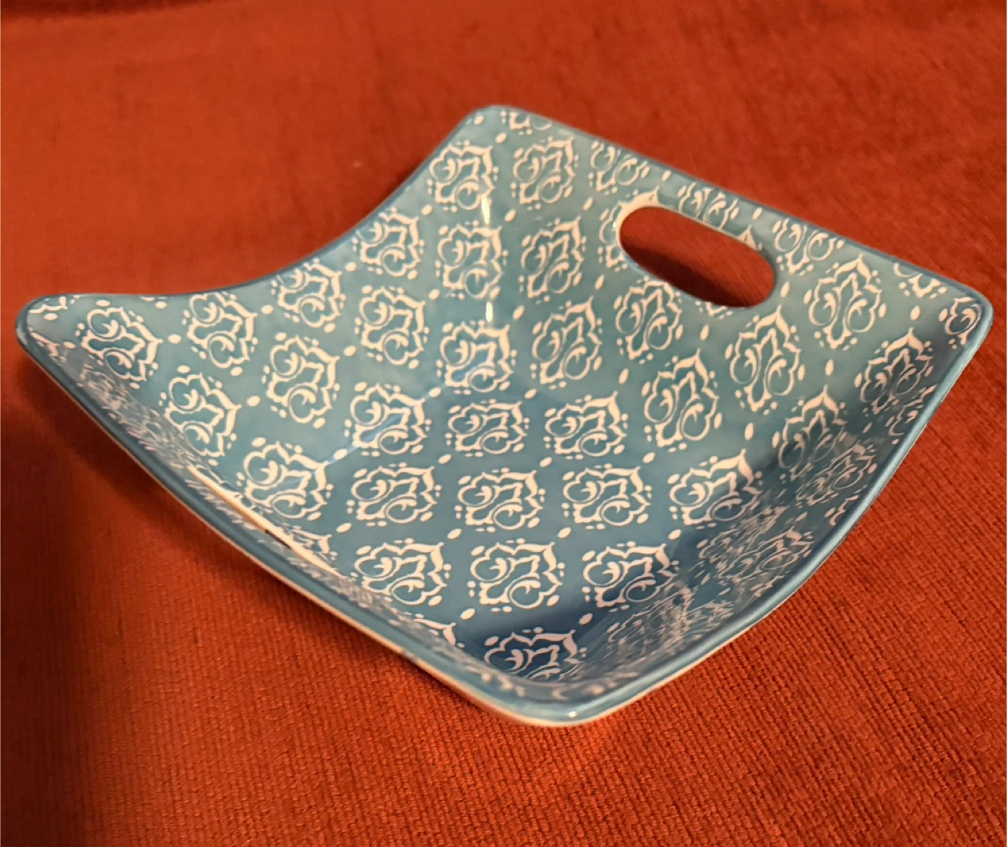 This attractive ceramic serving dish from Certified International features a charming blue and white pattern.