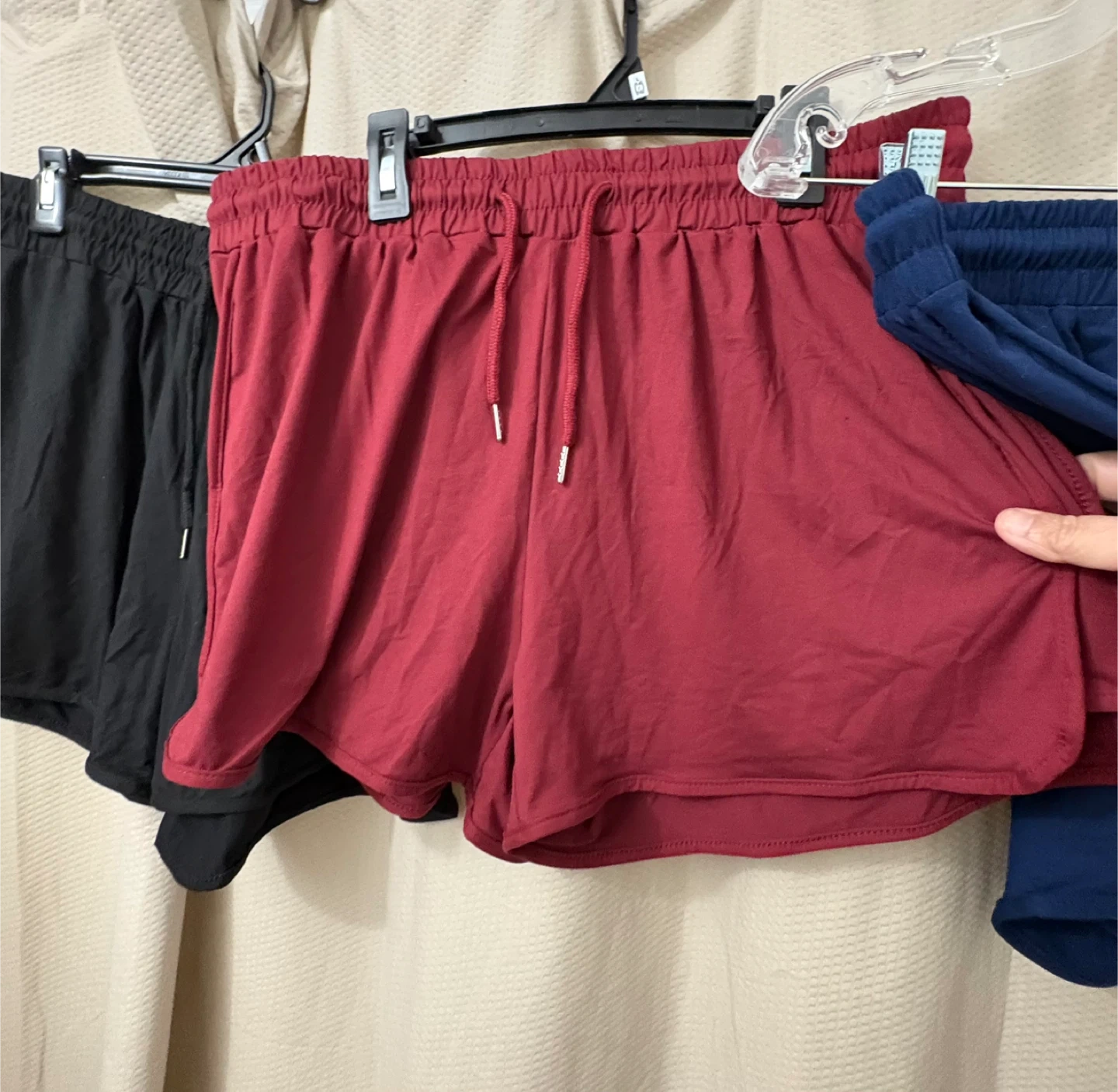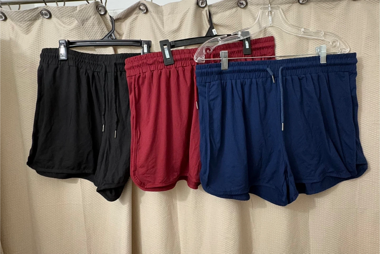 Three pairs of athletic shorts in black, burgundy, and navy blue. These shorts feature an elastic waistband with a drawstring and a relaxed fit. They're made from a comfortable, breathable fabric.