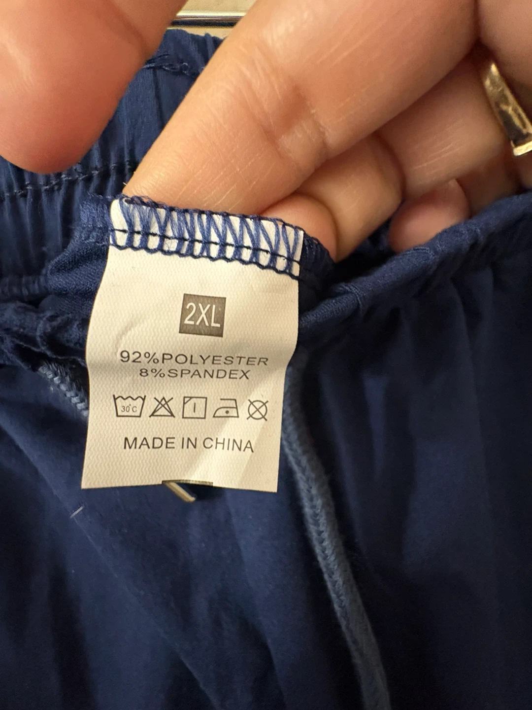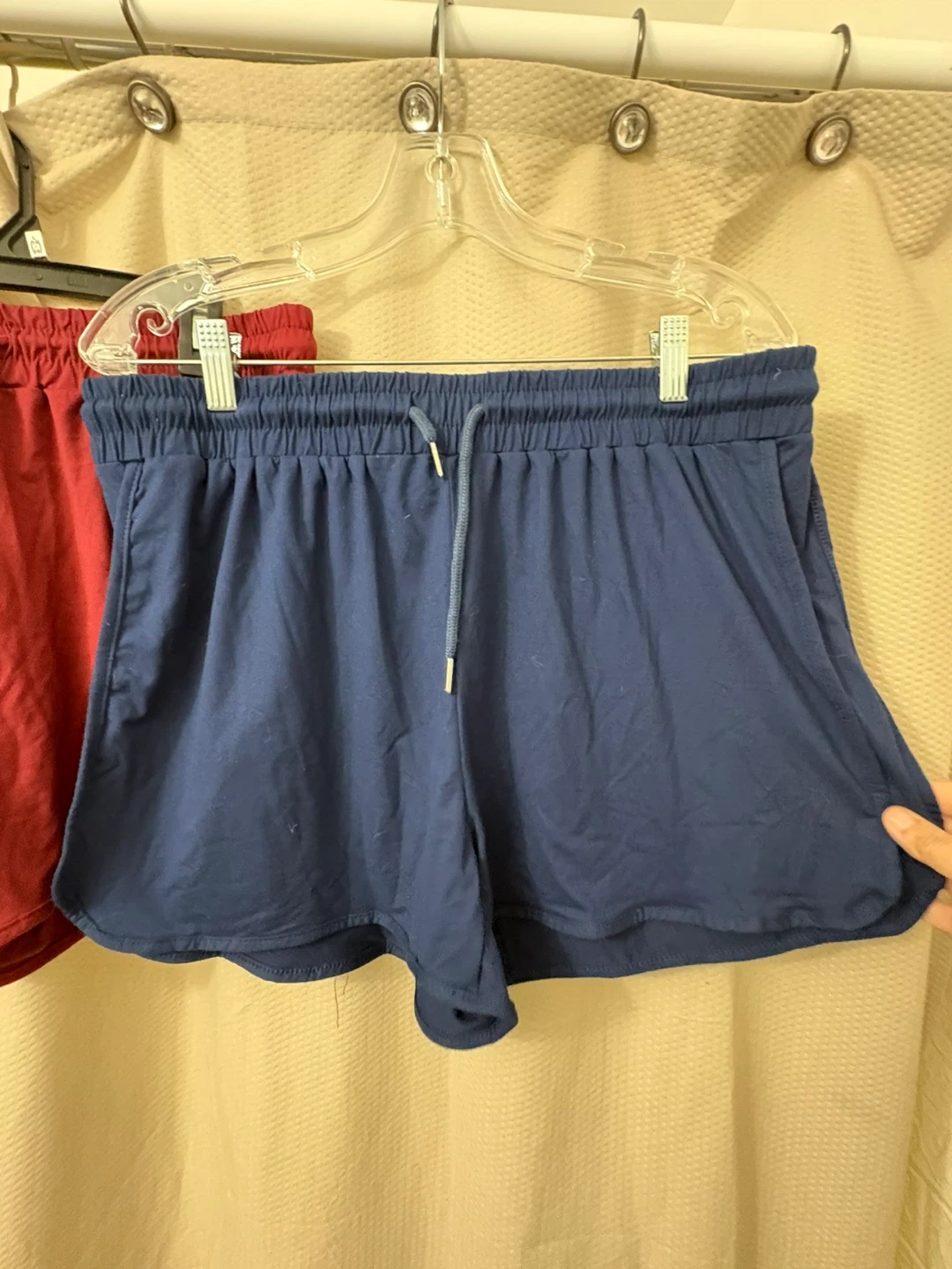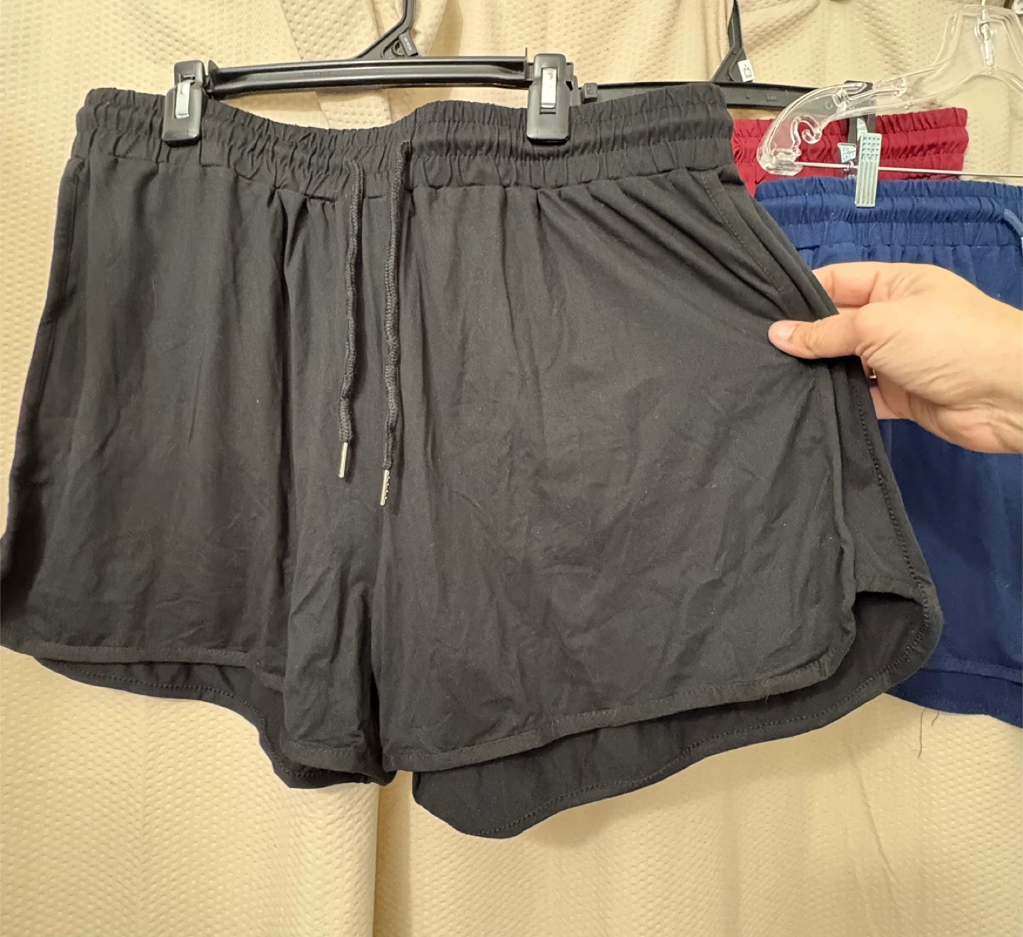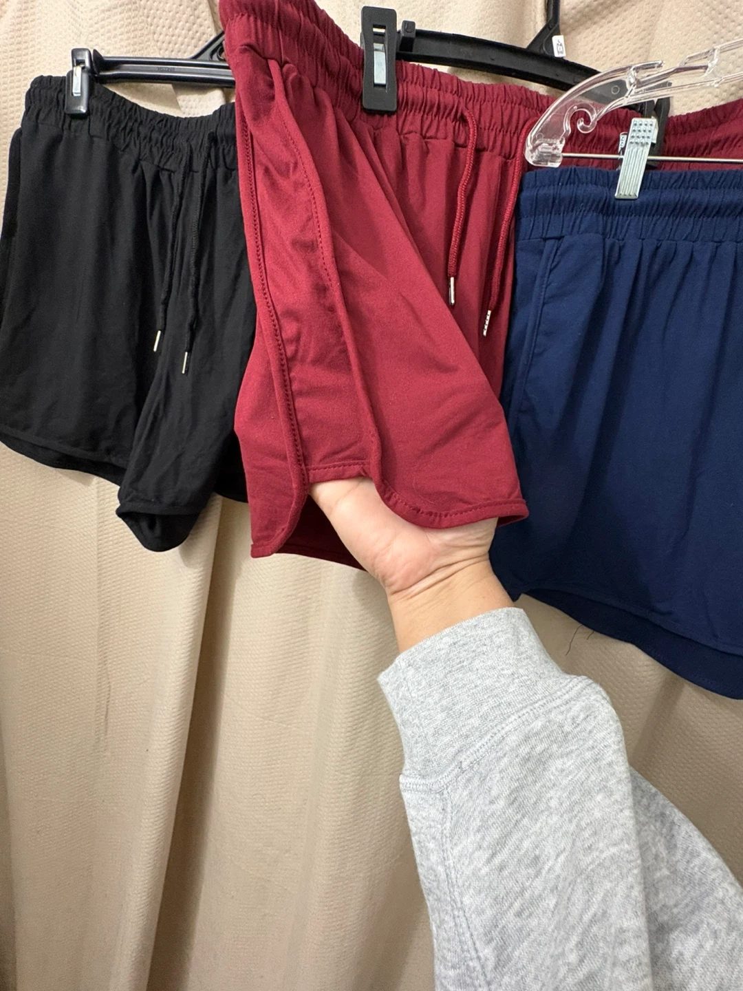 Three pairs of athletic shorts in black, burgundy, and navy blue. These shorts feature an elastic waistband with a drawstring and a relaxed fit. They're made from a comfortable, breathable fabric.