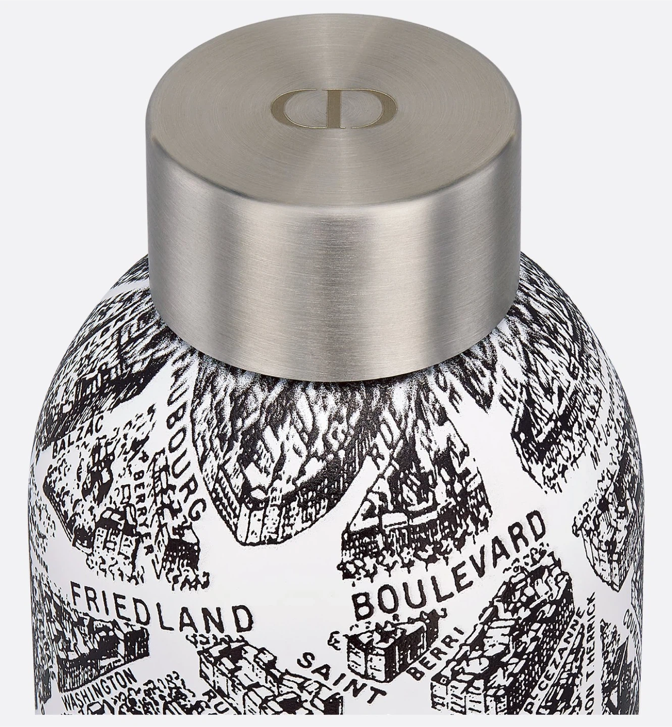 Dior Maison showcases the Plan de Paris line in celebration of the streets of Paris: from Faubourg-Saint-Honoré This is a Christian Dior Plan de Paris stainless steel water bottle.