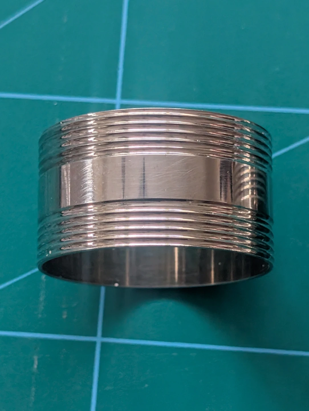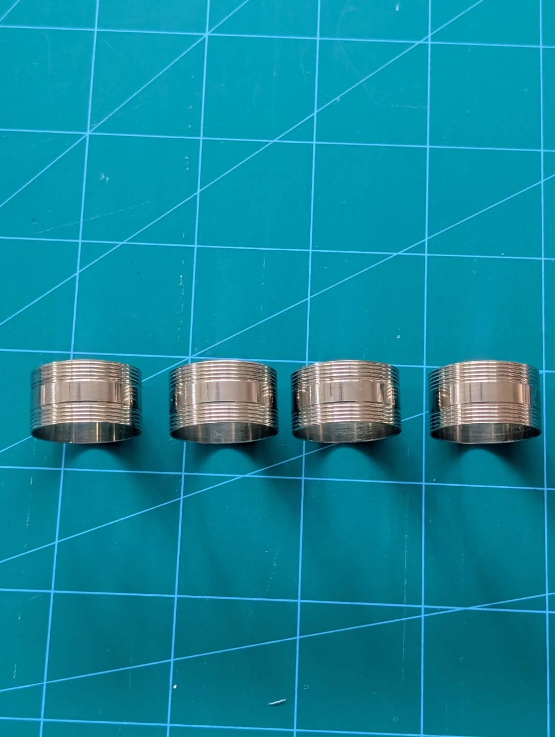A set of four shiny silver-toned napkin rings. They have a ribbed design with a smooth band in the middle. These would dress up any table setting for a dinner party!