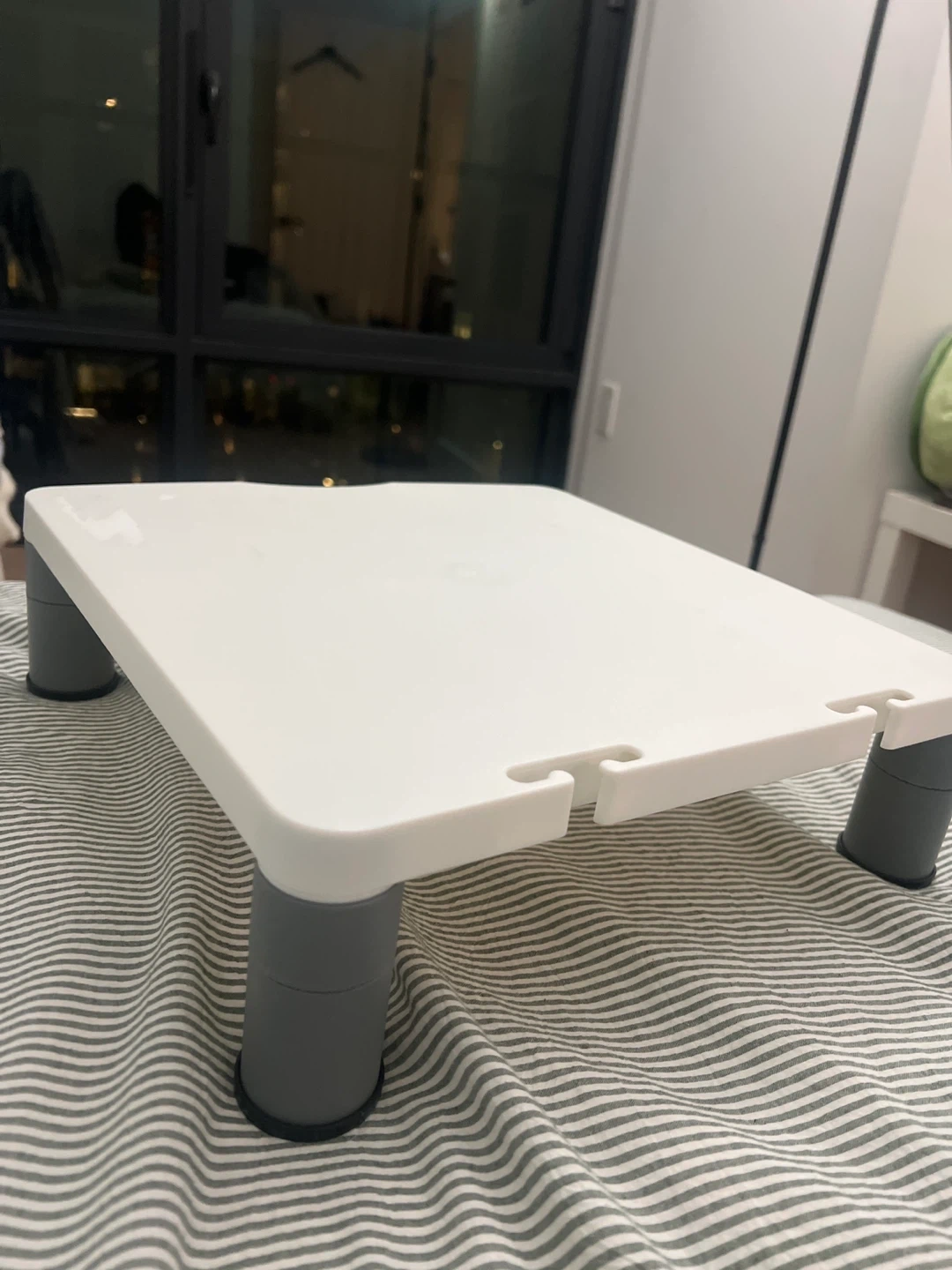 This ~3 inch white monitor stand riser offers adjustable height with its grey legs. It has cutouts on the sides for cable management. It's a versatile item for organizing your desk space.