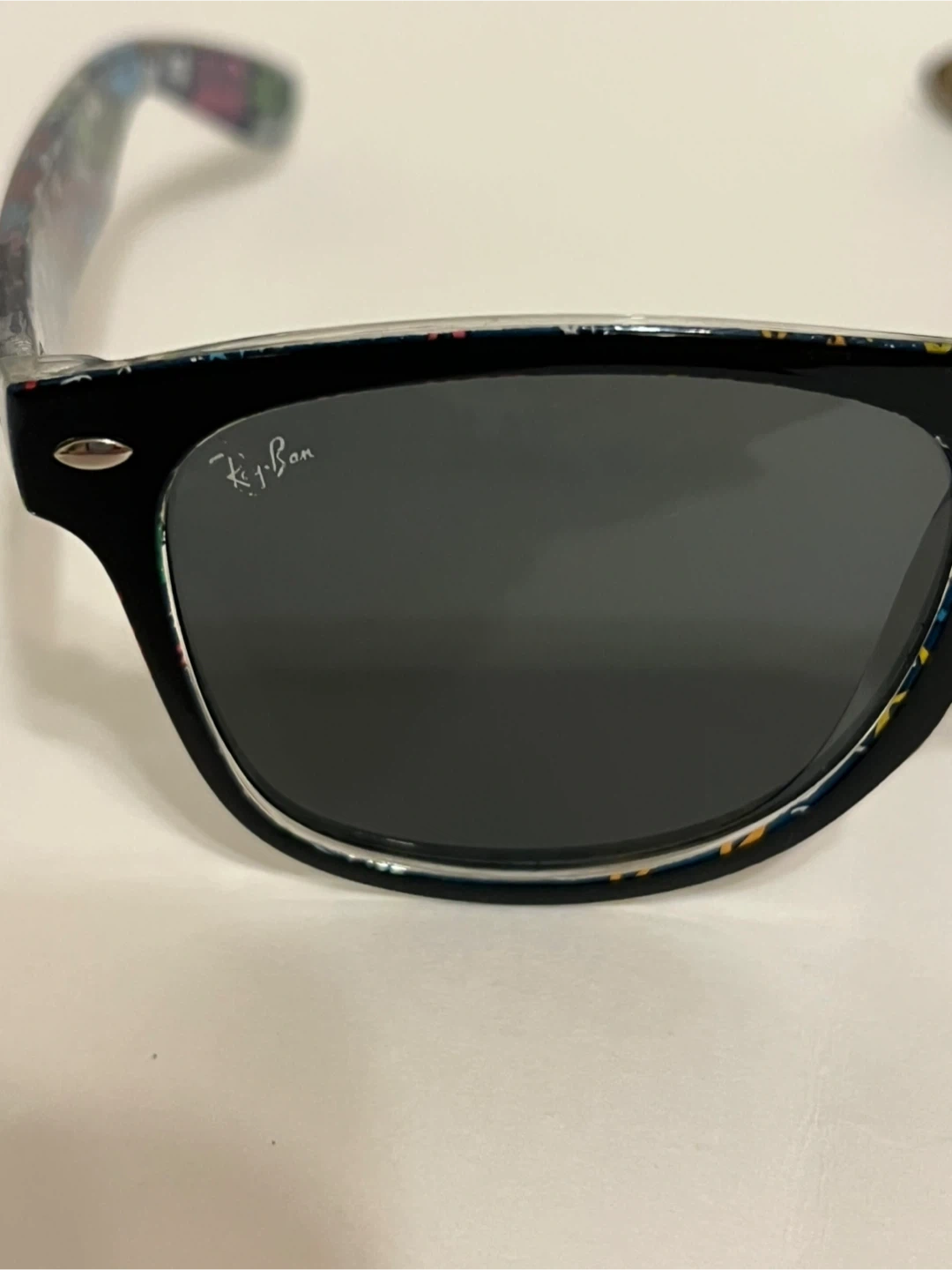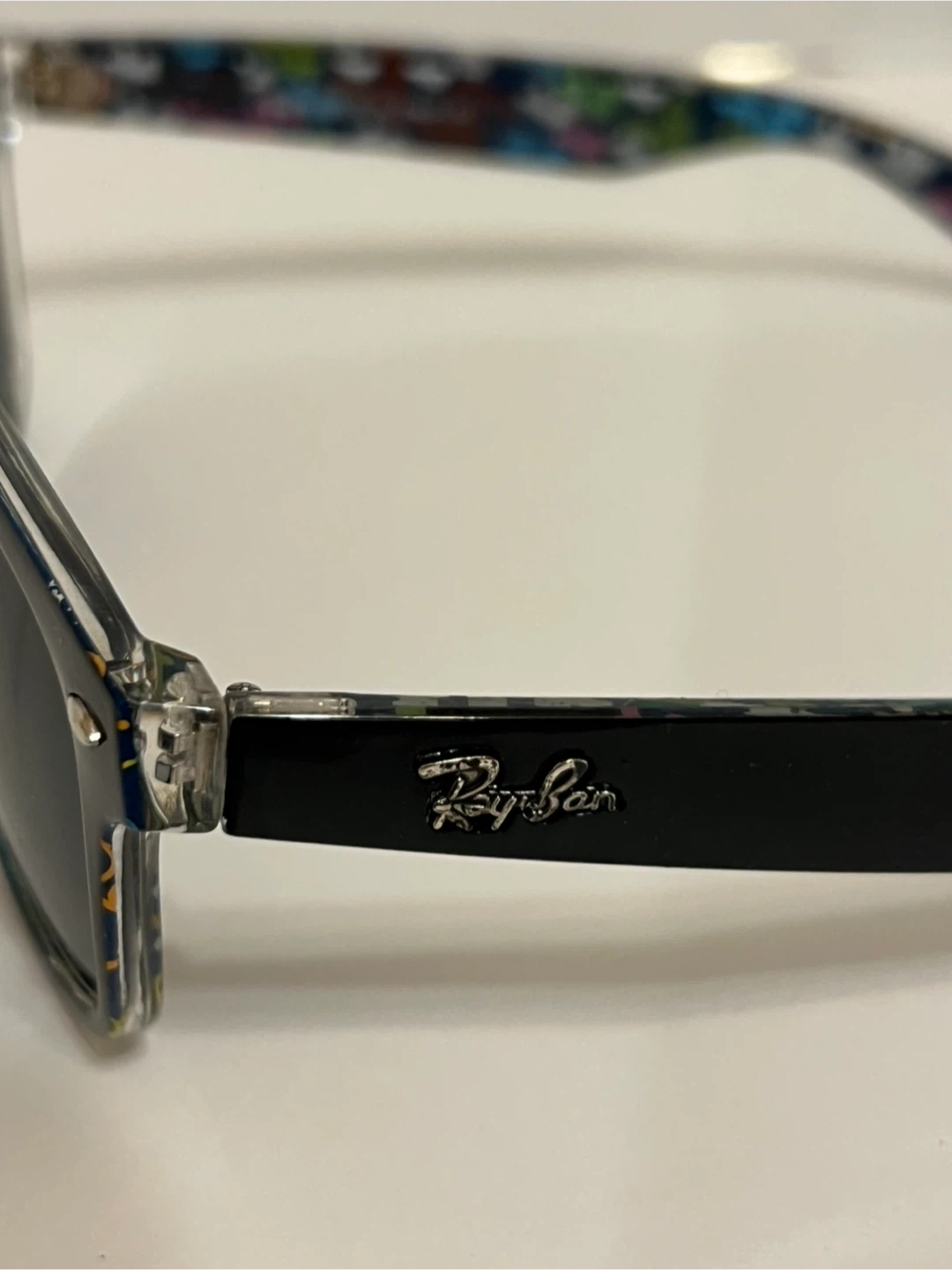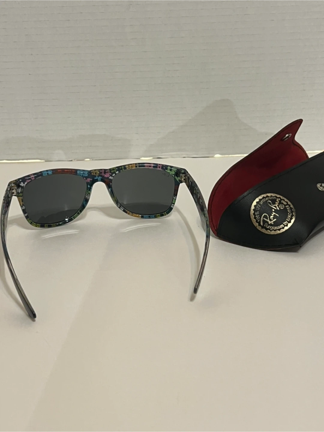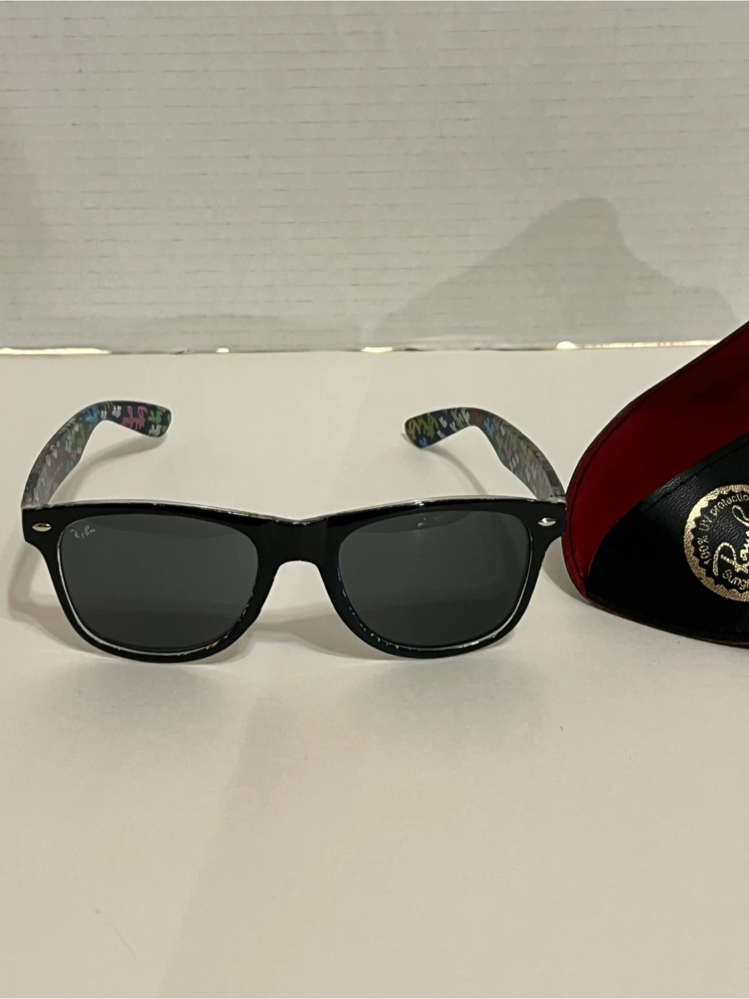 These Ray-Ban Wayfarer sunglasses have a dark gray lens and a colorful patterned frame. They are made in Italy. Includes a black and red case. Ray Bab Vintage Wayfarer Sunglasses Black outer Ray Ban logos print covering inside. Made in Italy, RB2132 54[]20. Ray Ban case included (little brother took case and carved into it so there’s marks on it-see photo)