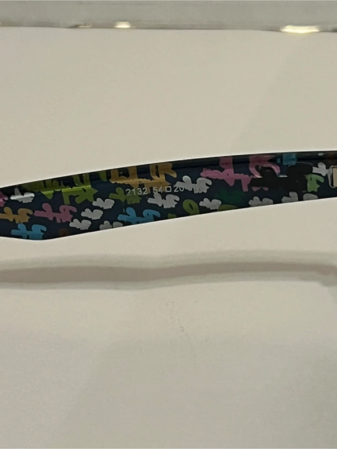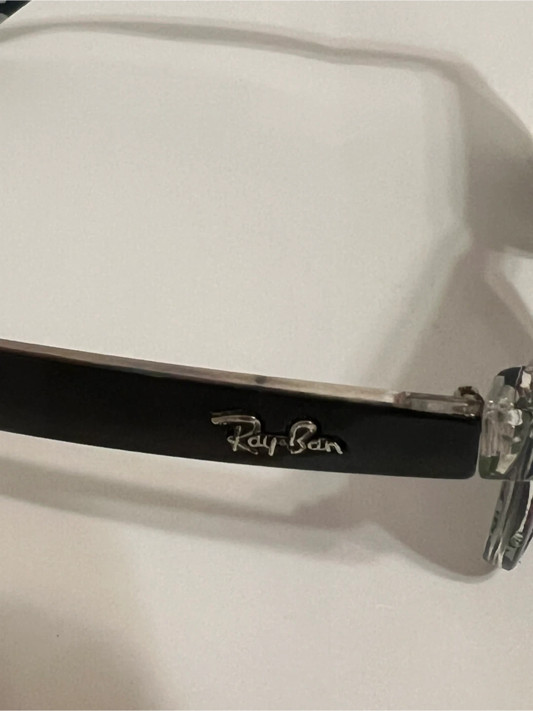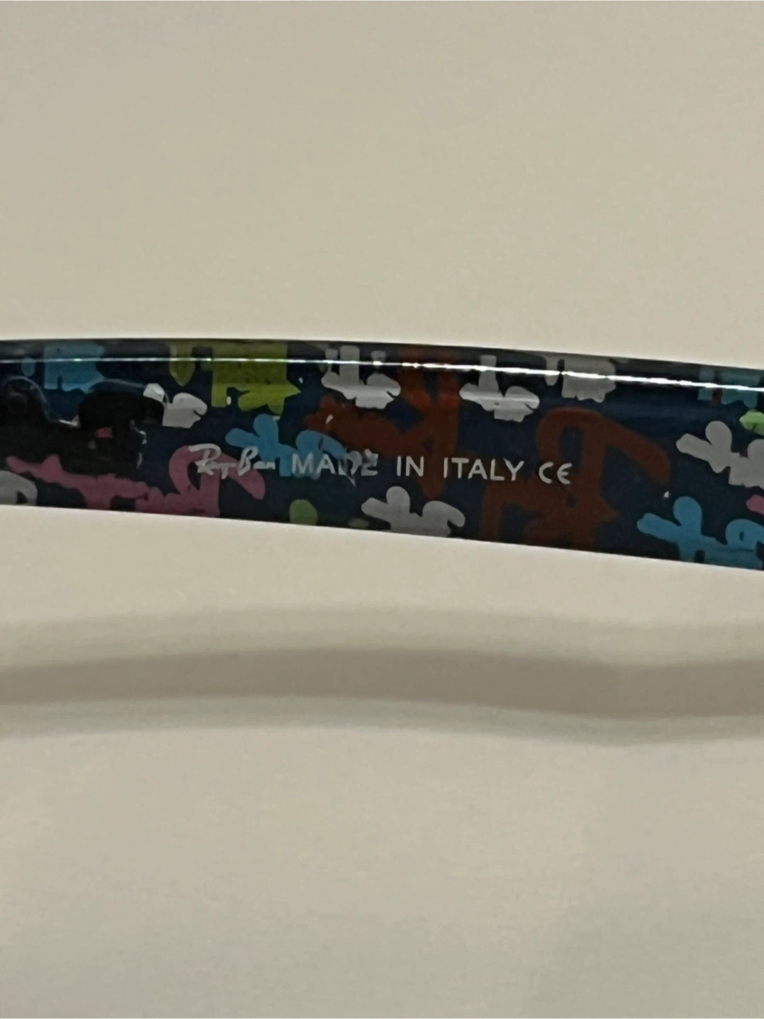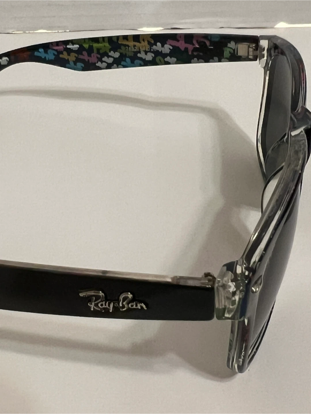 These Ray-Ban Wayfarer sunglasses have a dark gray lens and a colorful patterned frame. They are made in Italy. Includes a black and red case. Ray Bab Vintage Wayfarer Sunglasses Black outer Ray Ban logos print covering inside. Made in Italy, RB2132 54[]20. Ray Ban case included (little brother took case and carved into it so there’s marks on it-see photo)