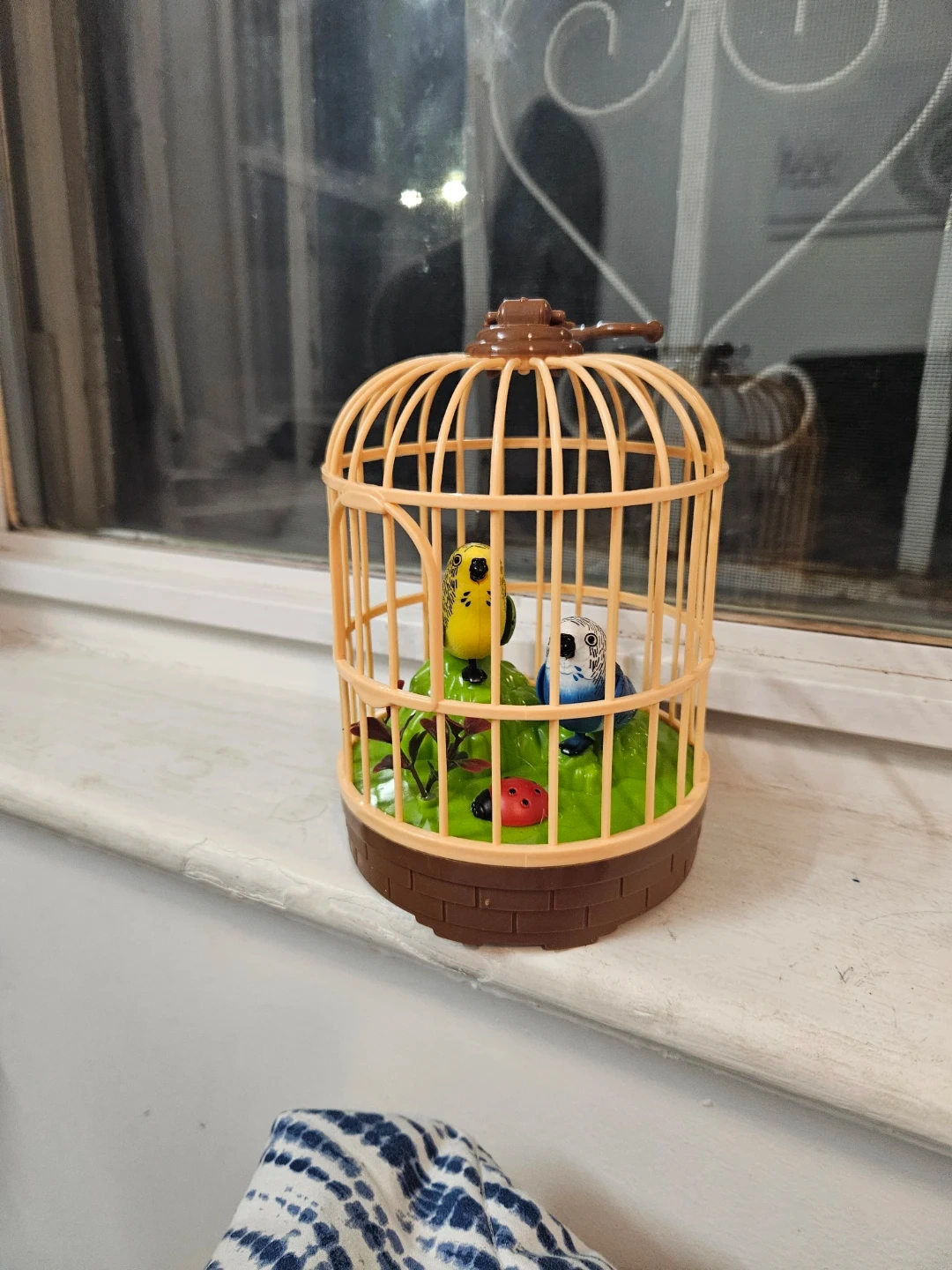 This is a fun toy bird cage with two colorful budgies inside. It also includes a little ladybug on the green base. The cage is made of plastic and has a latch on top.and birds make a voice too.it says "hello I love you"