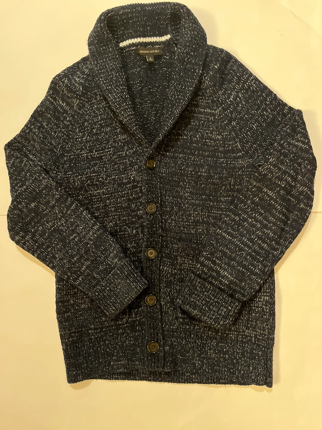 This is a Banana Republic knit cardigan. It features a shawl collar and button front. The size is S.