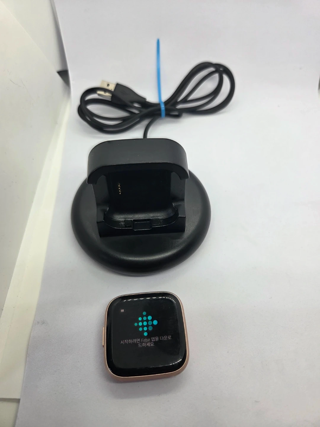 Rose gold Fitbit Versa 2 smartwatch. It comes with a charging cable and dock. Includes a pink band, plus black, purple, and white bands in the original packaging.