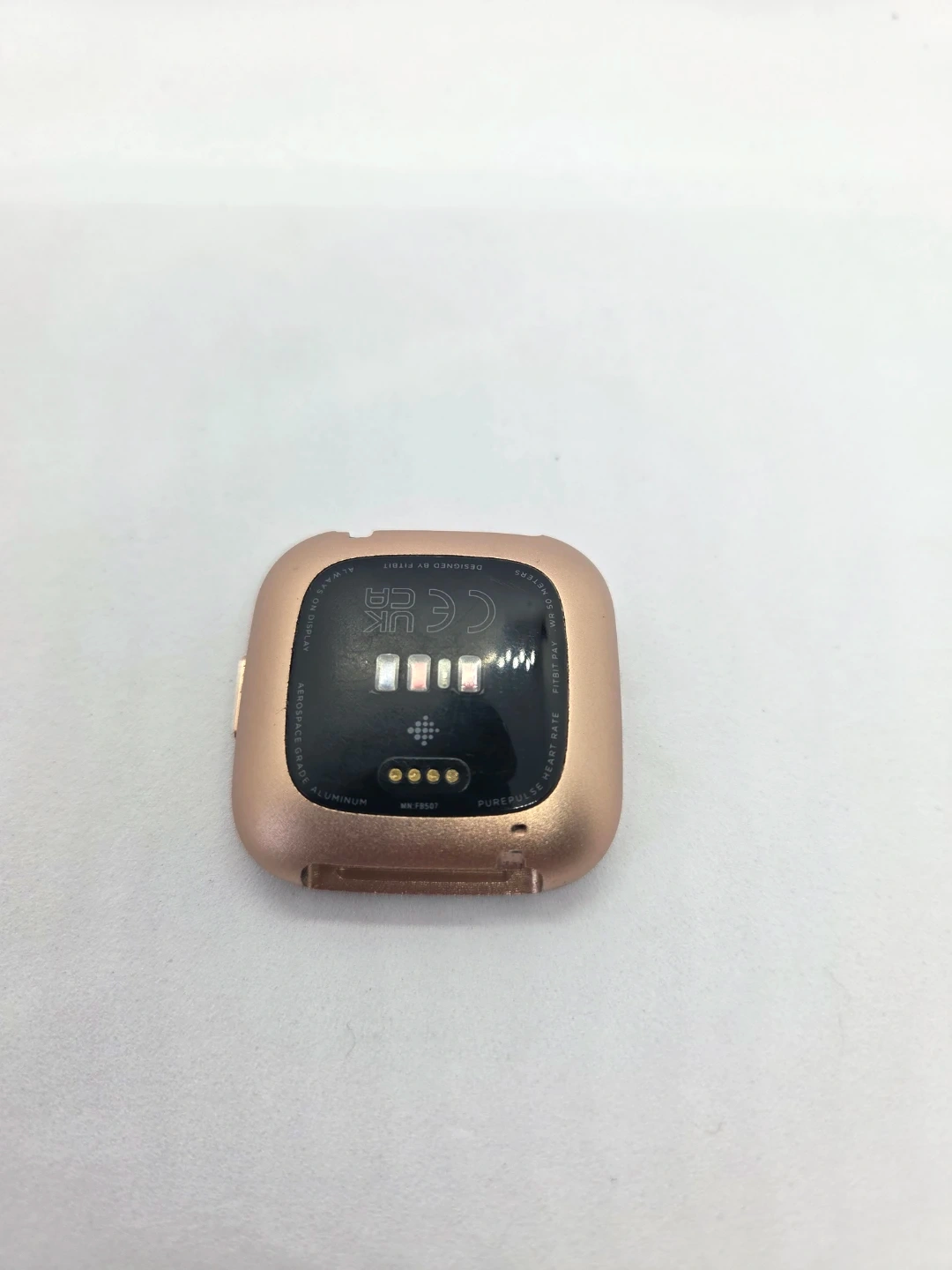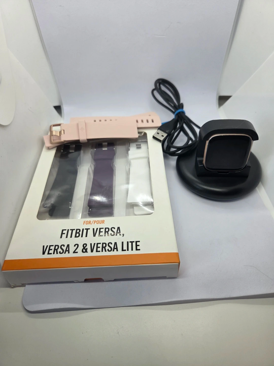 Rose gold Fitbit Versa 2 smartwatch. It comes with a charging cable and dock. Includes a pink band, plus black, purple, and white bands in the original packaging.