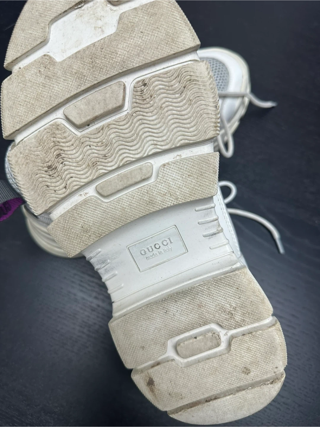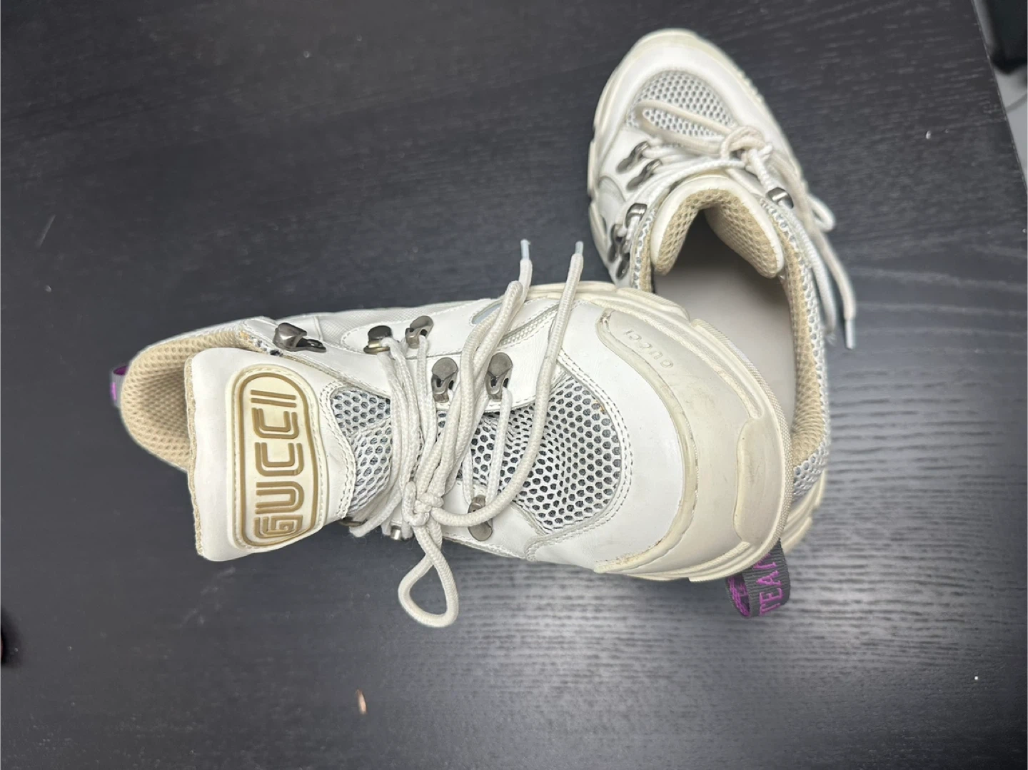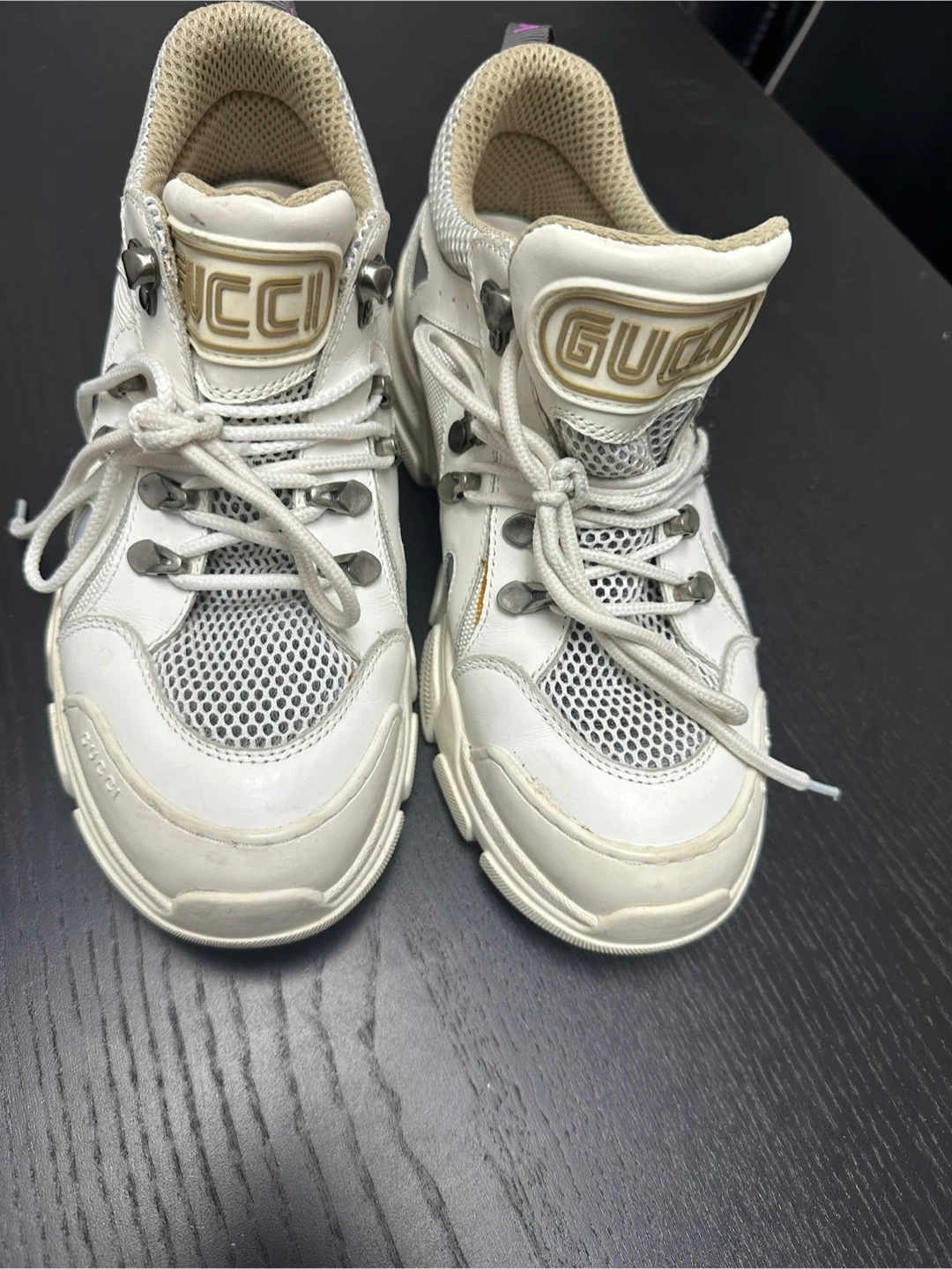Gucci women's sneakers in white leather and mesh. Made in Italy. These trainers are a stylish addition to any wardrobe.