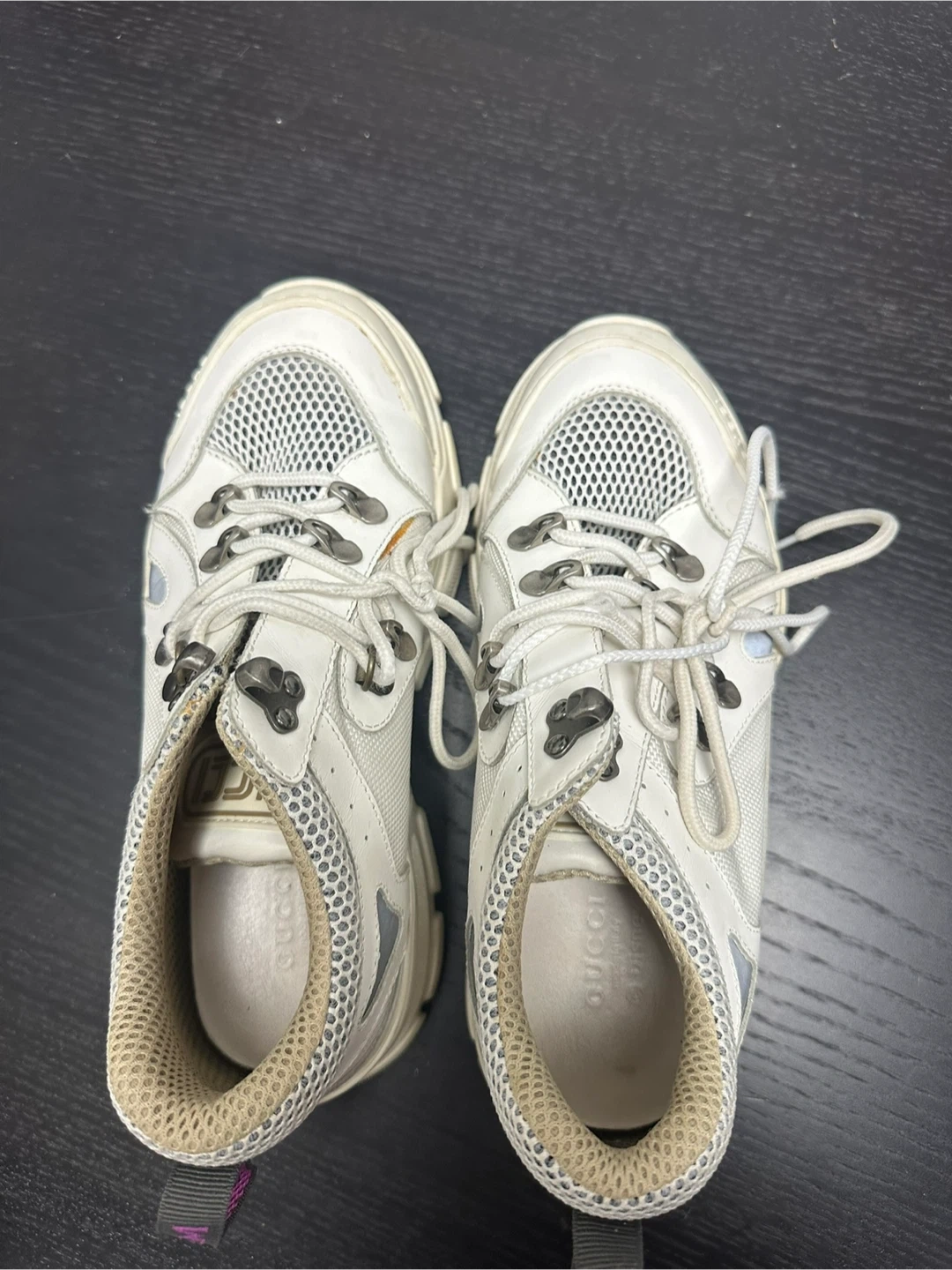Gucci women's sneakers in white leather and mesh. Made in Italy. These trainers are a stylish addition to any wardrobe.