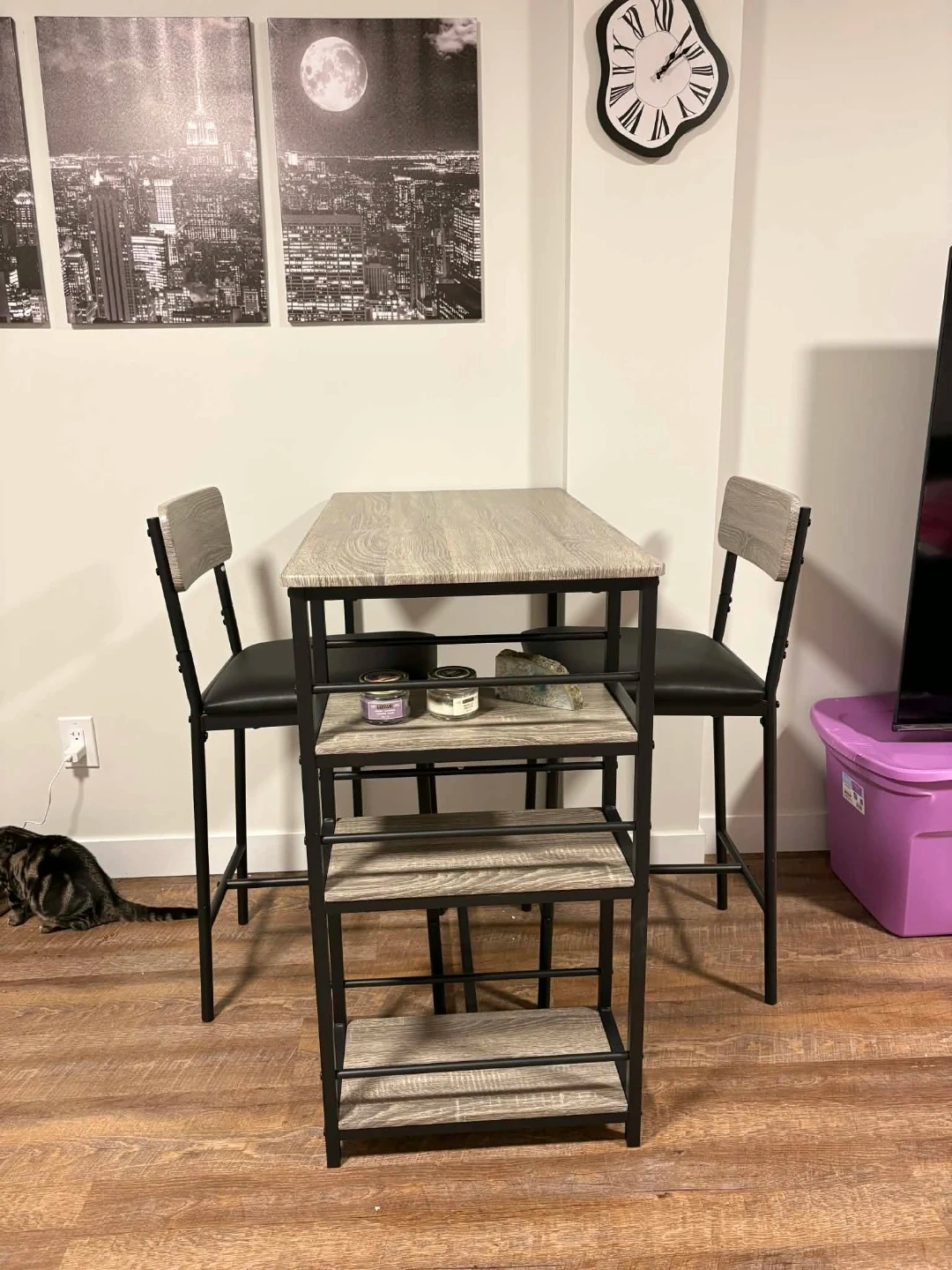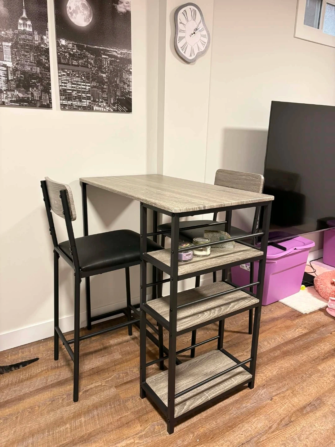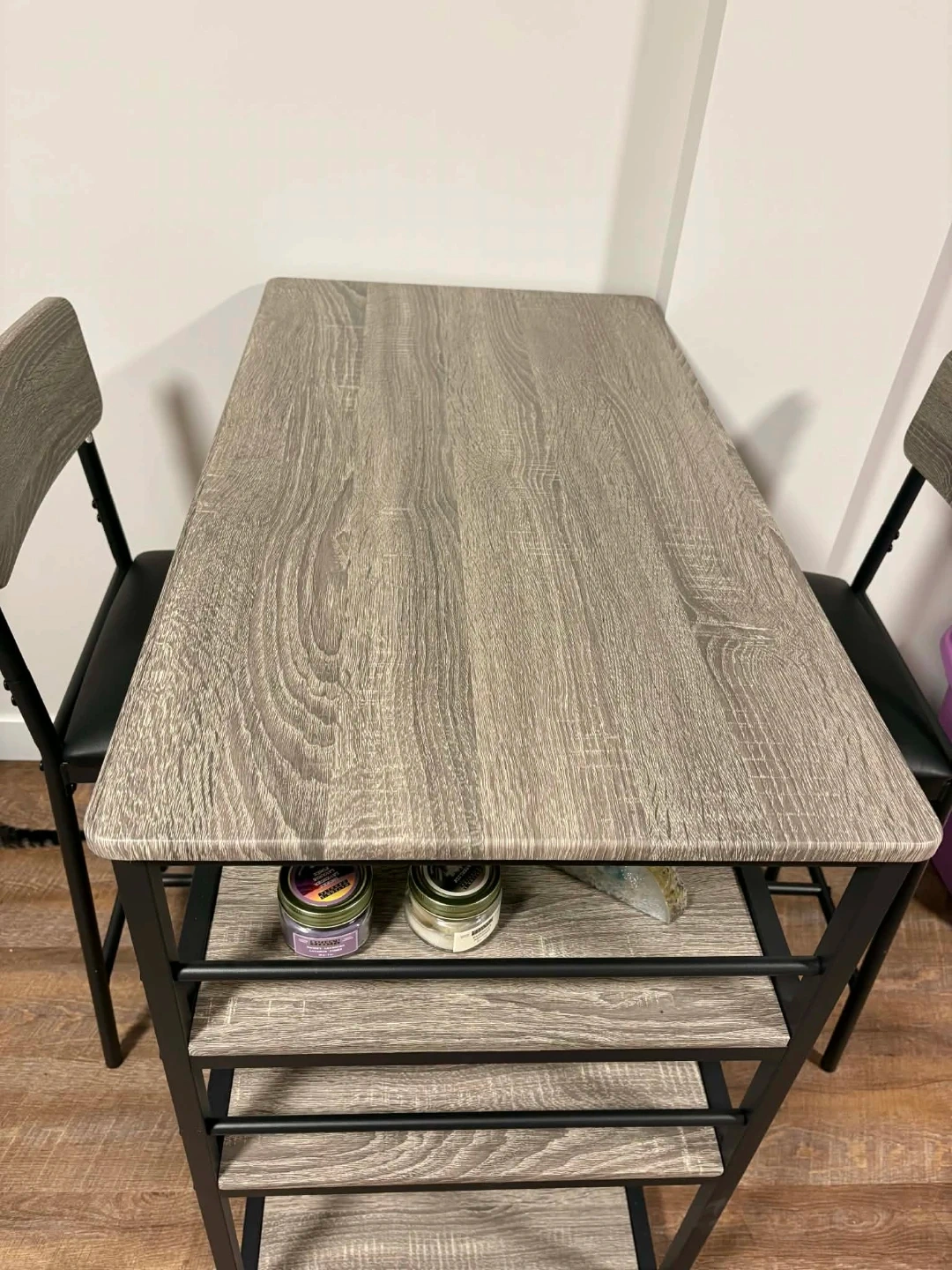 This set includes a bar height table with two matching stools. The table and stool backs have a faux wood grain finish. The seat and backrest of the stools are upholstered in black. Also storage shelf and it's great for small spaces!