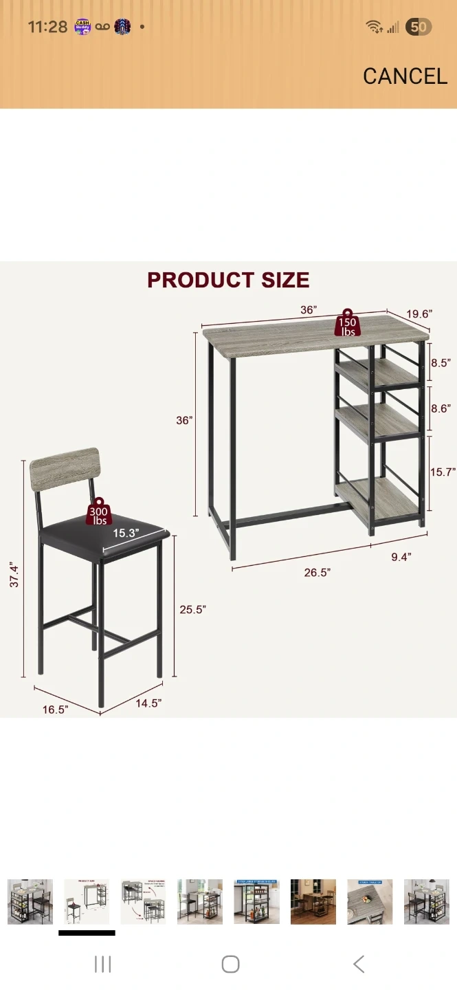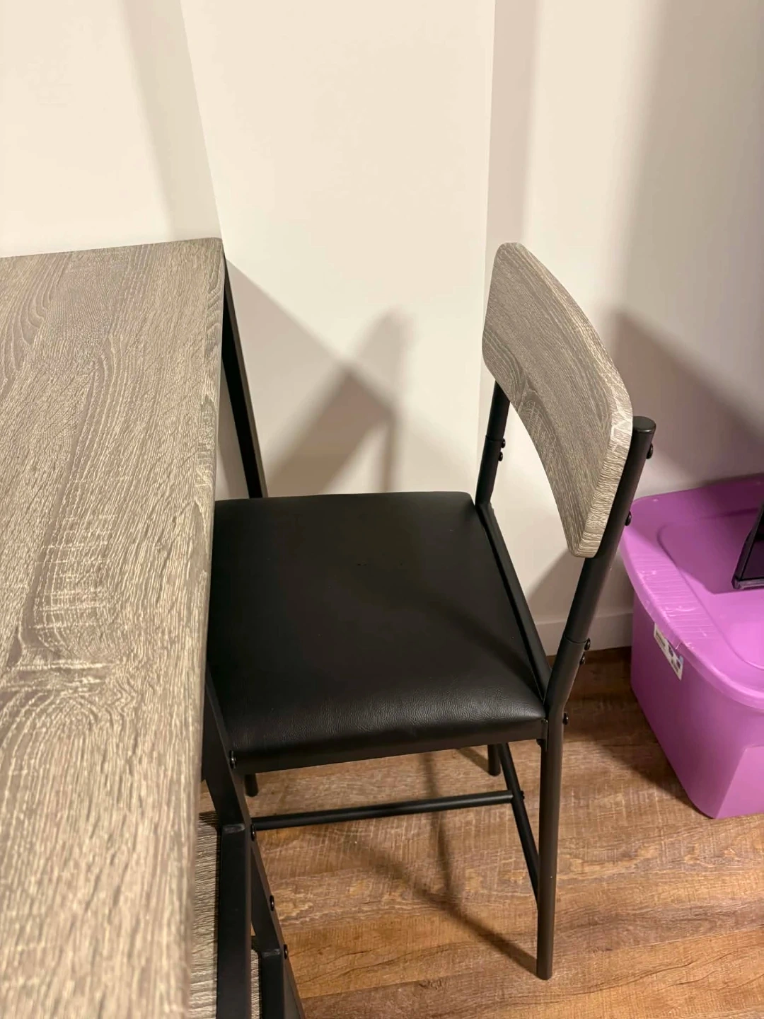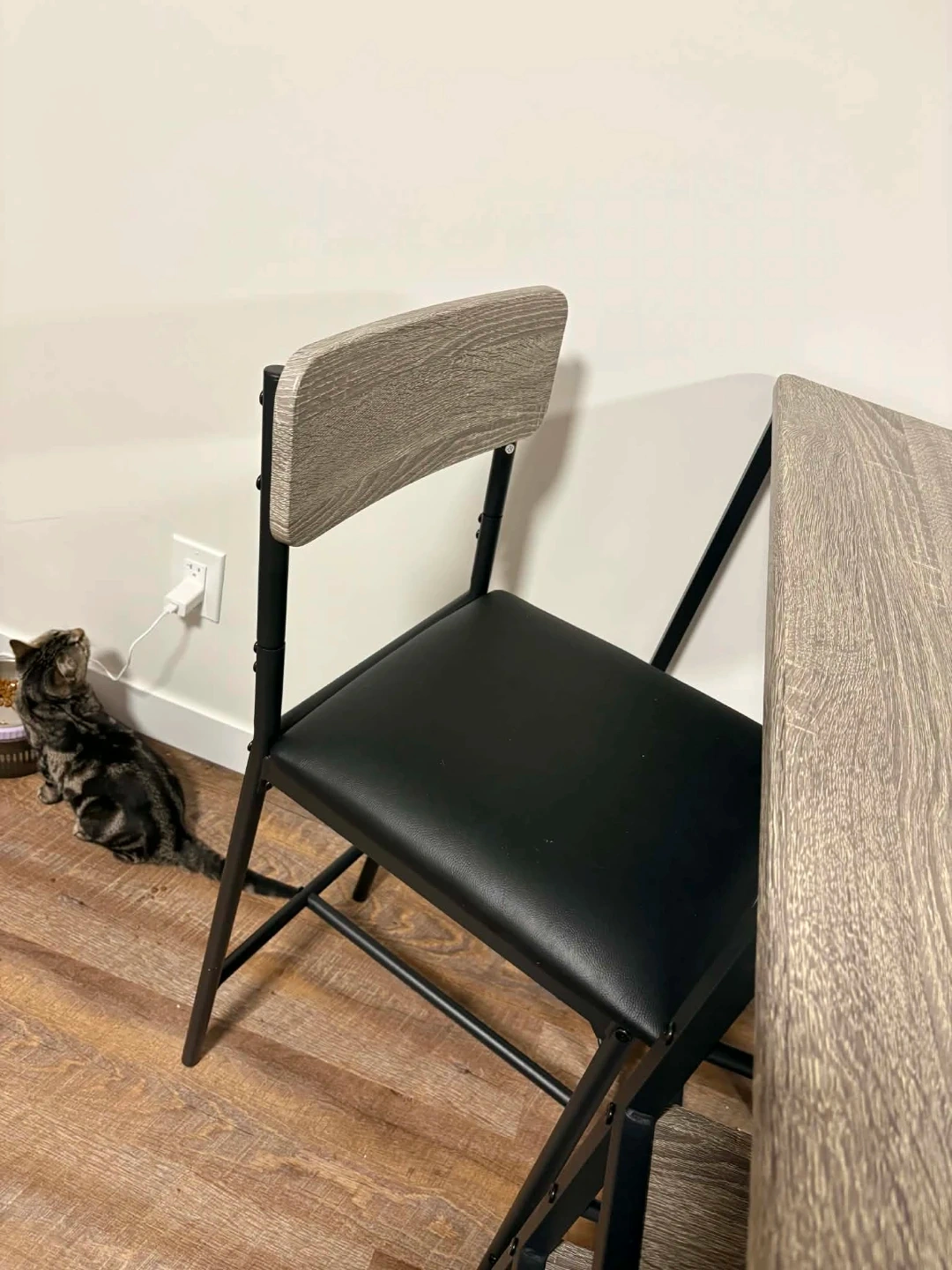 This set includes a bar height table with two matching stools. The table and stool backs have a faux wood grain finish. The seat and backrest of the stools are upholstered in black. Also storage shelf and it's great for small spaces!