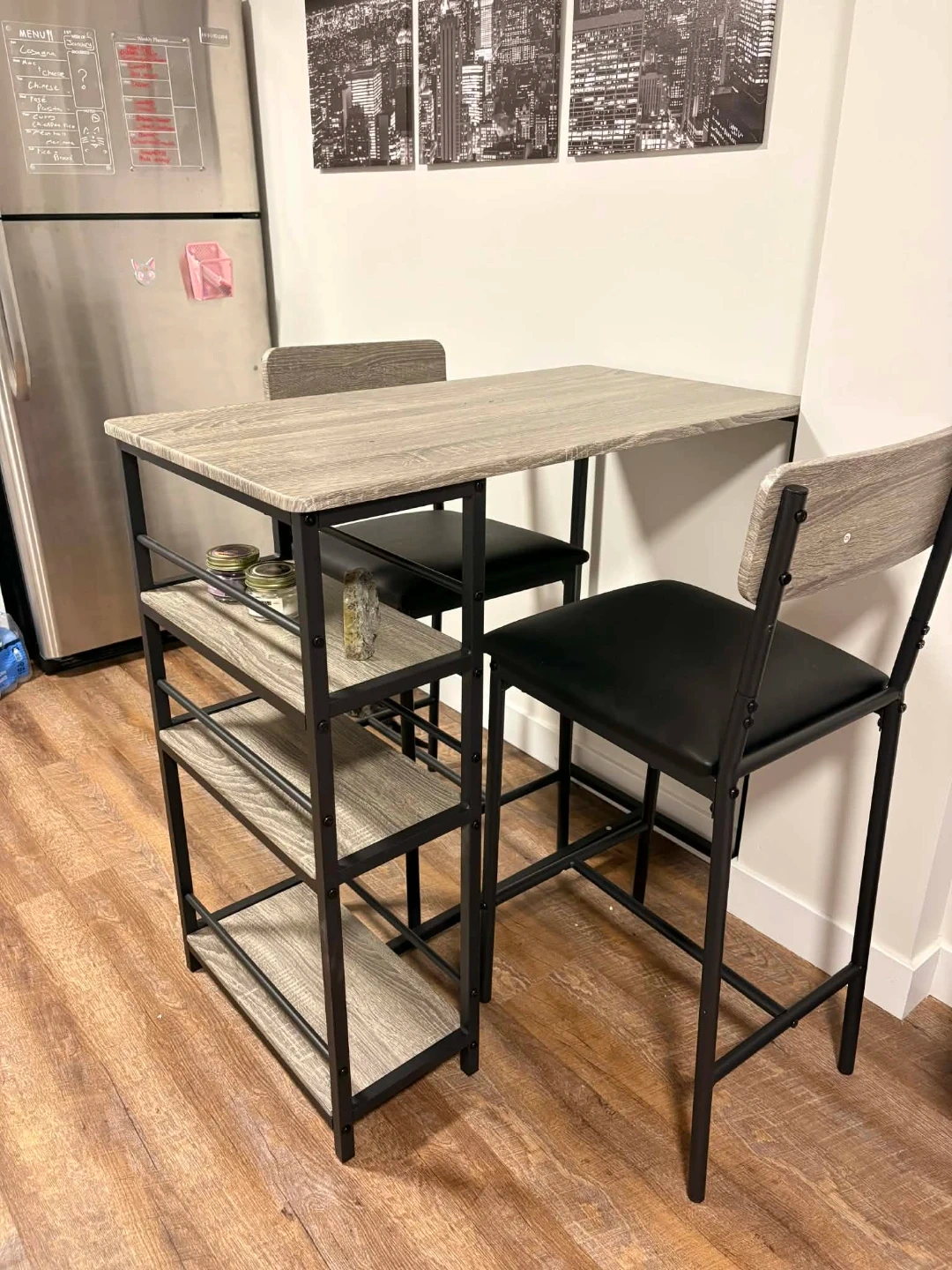 This set includes a bar height table with two matching stools. The table and stool backs have a faux wood grain finish. The seat and backrest of the stools are upholstered in black. Also storage shelf and it's great for small spaces!