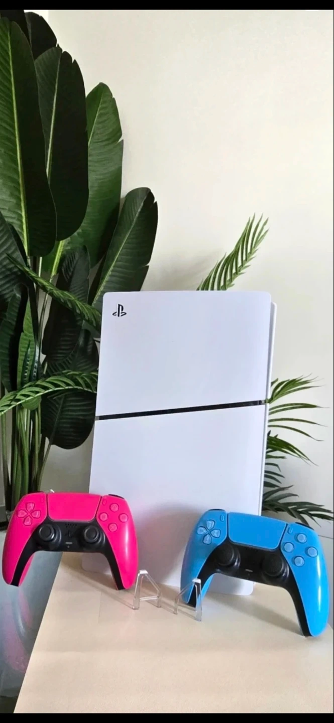 Sony PlayStation 5 console Slim disc TB version. Includes one pink DualSense controller and one blue DualSense controller. This console is ready for next-gen gaming!