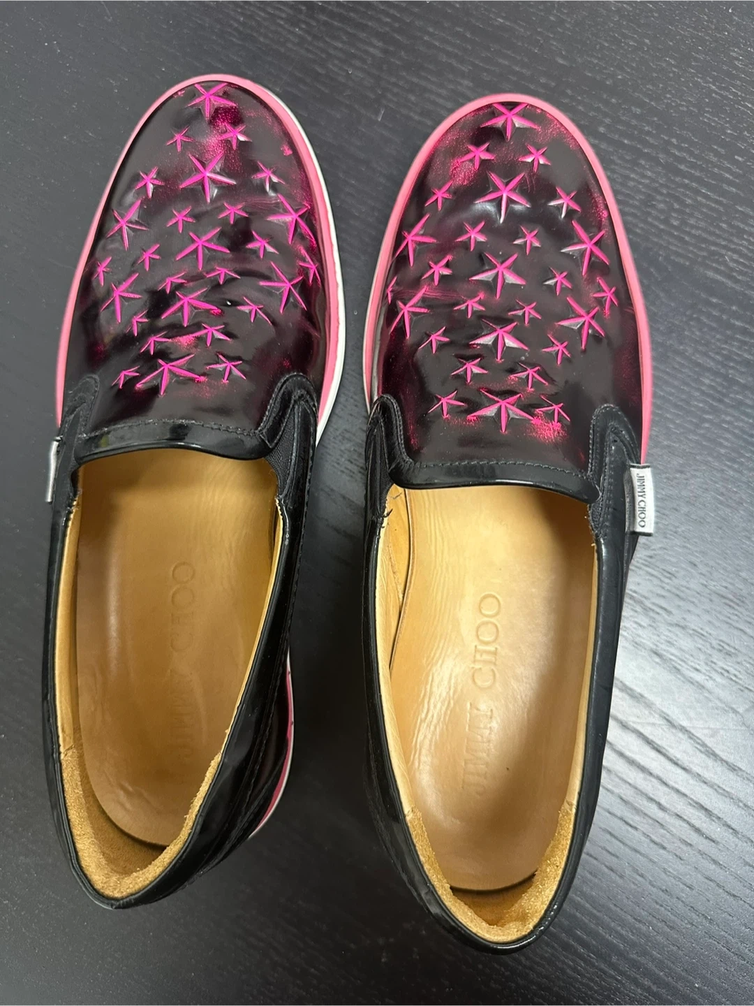 These Jimmy Choo slip-on sneakers are black with a patent finish and feature a vibrant pink star pattern. They have a contrasting pink sole and interior lining. Made in Italy. A stylish statement piece for any wardrobe!