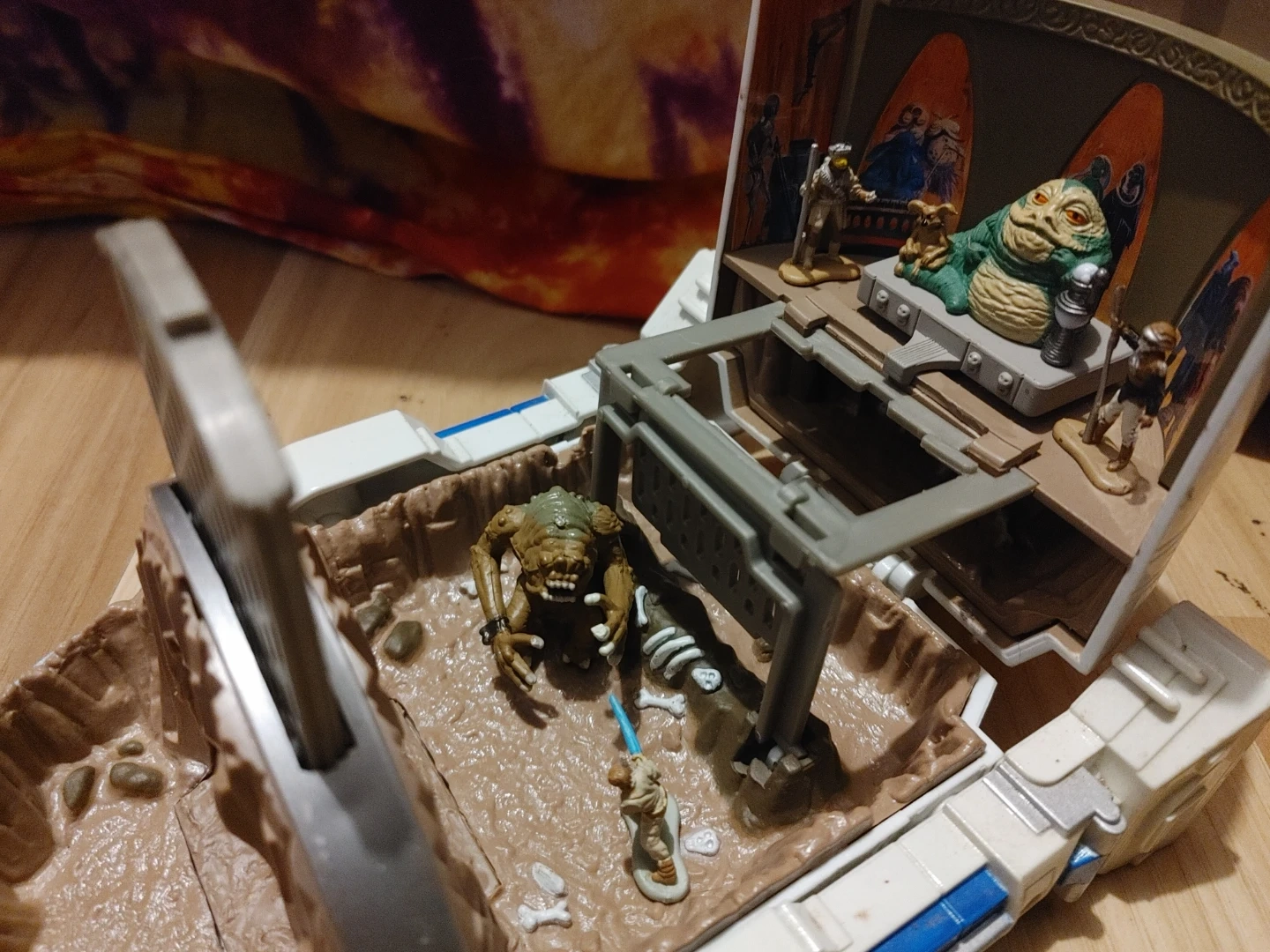 This Star Wars Micro Machines playset brings iconic scenes to life! It features Jabba's Palace with multiple levels and characters. Includes a Slave I ship and various action figures. Perfect for recreating memorable movie moments!