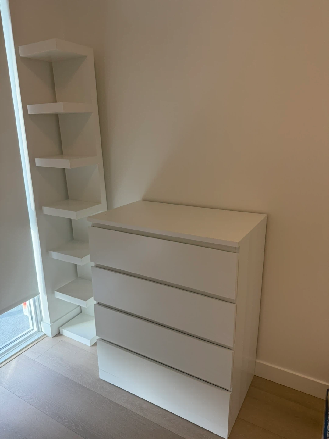 A tall, narrow white shelving unit with five shelves. It's great for organizing books or decorative items. This unit would be useful for small spaces needing extra storage.