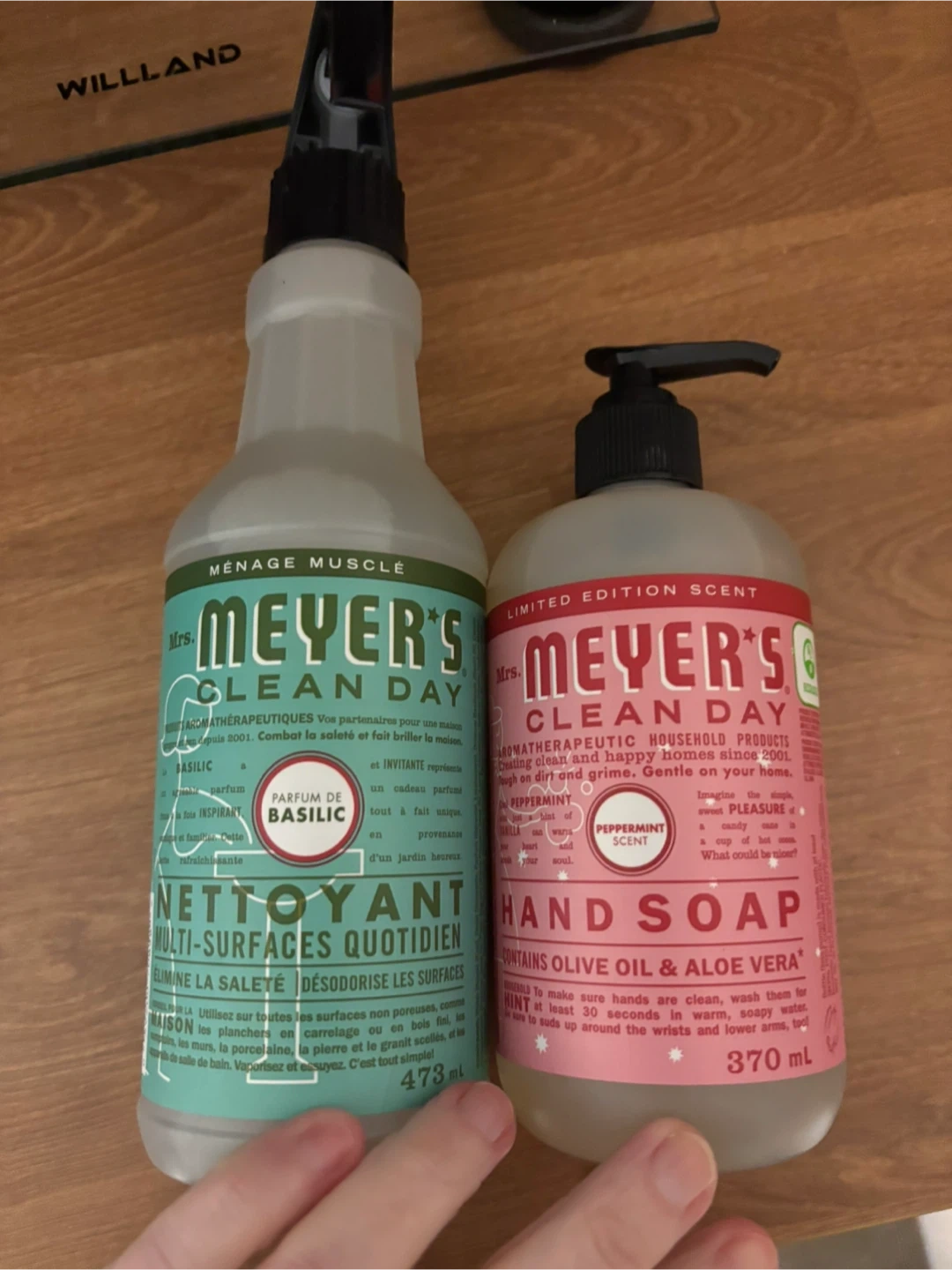 Includes Mrs. Meyer's Clean Day Multi-Surface Everyday Cleaner in Basil scent (473 mL) and Mrs. Meyer's Clean Day Hand Soap in Peppermint scent (370 mL). Both bottles have pump dispensers. This set is great for keeping your home clean and smelling fresh!